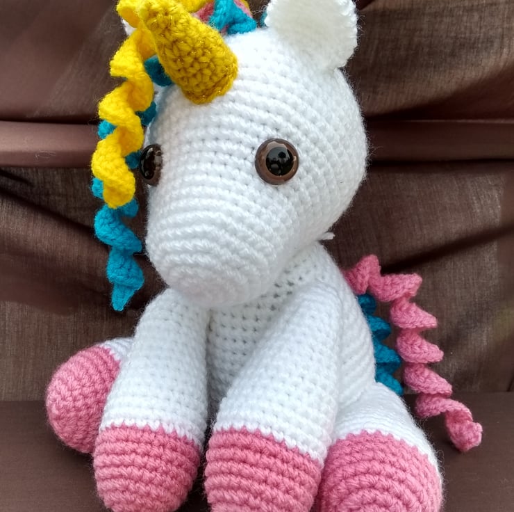 A handmade crocheted unicorn in washable wool acrylic mix. It features metal backed safety eyes but can be made with sewn on eyes if required. Available in two colour ways, Rainbow Brights and Rainbow Pastels.