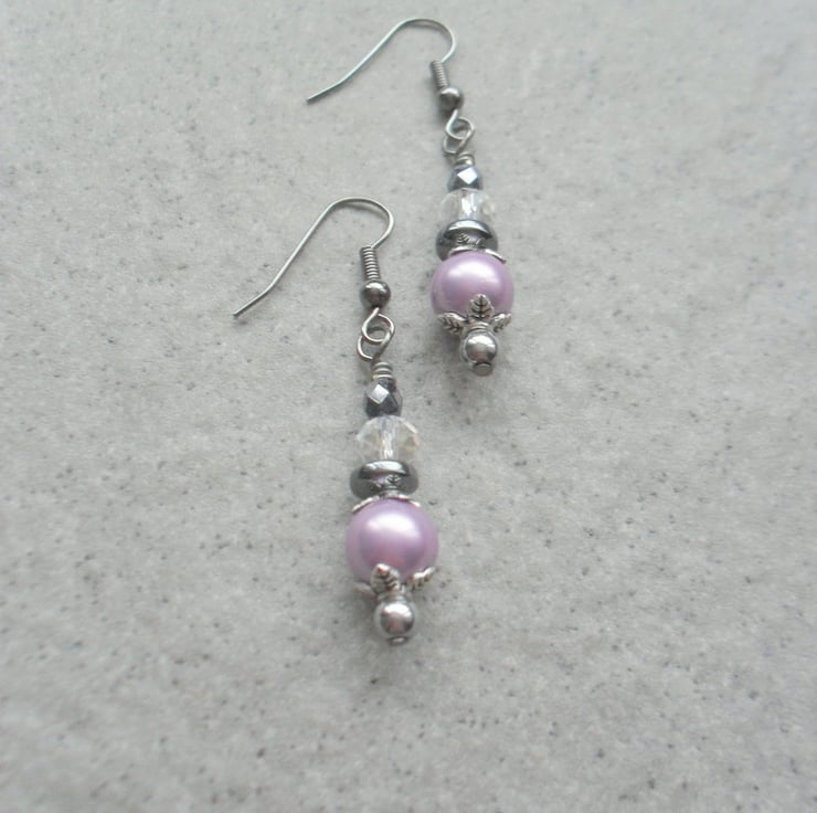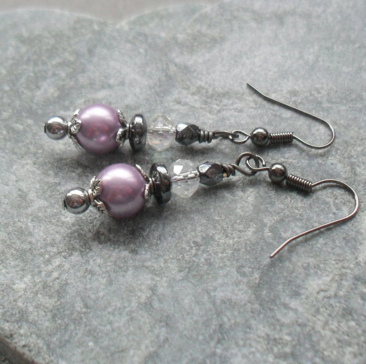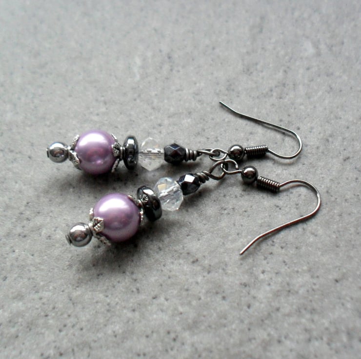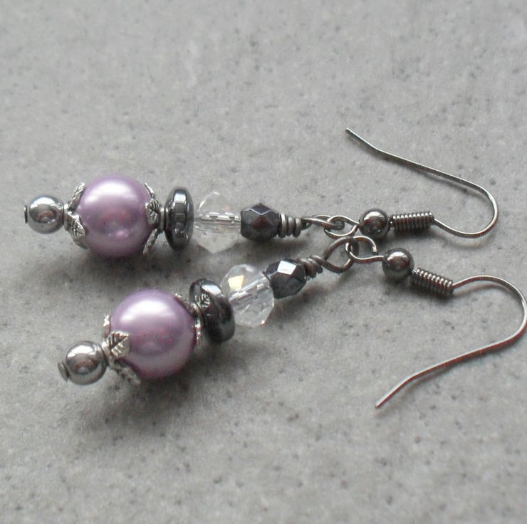 Lilac shell pearl, haematite, crystals and silver tone bead caps are attached to black tone ear wires.