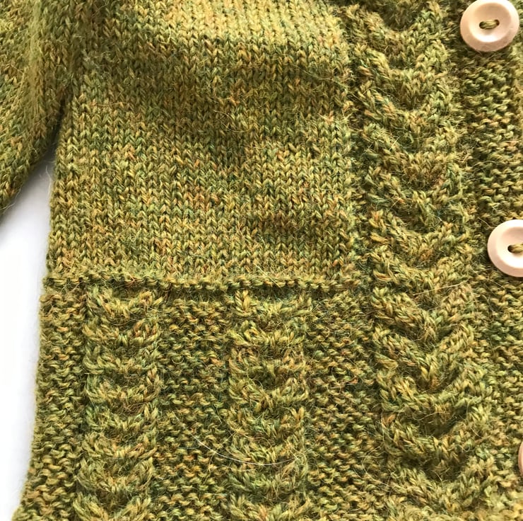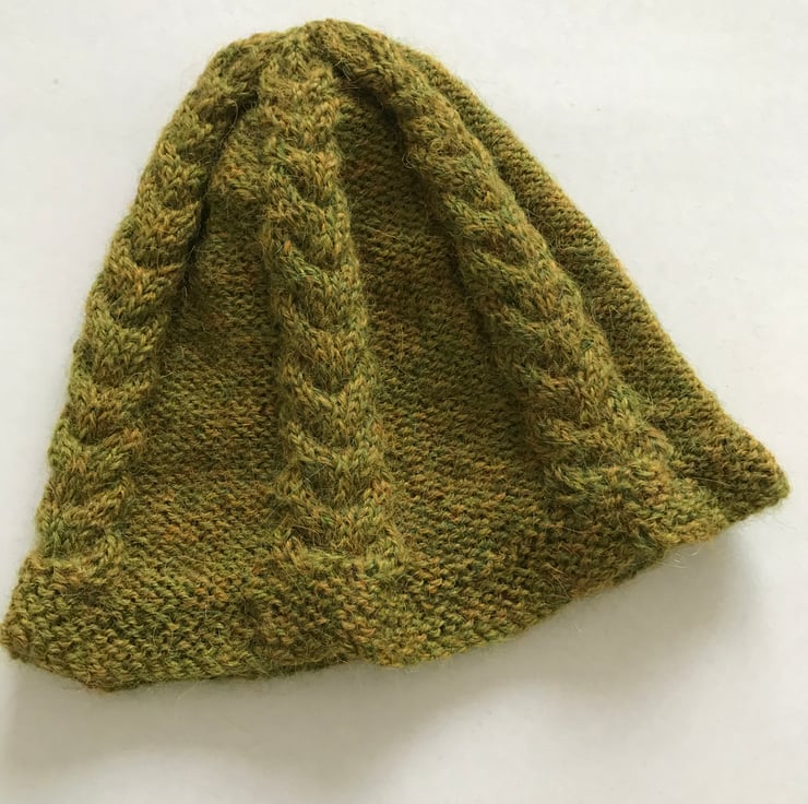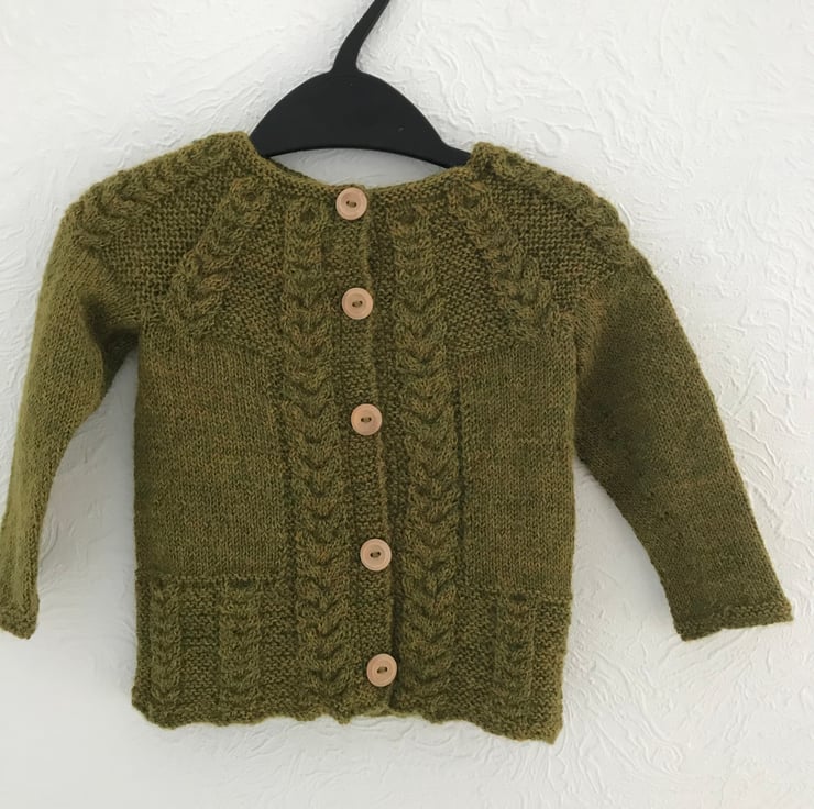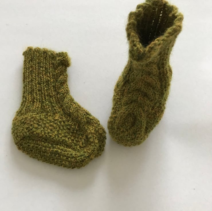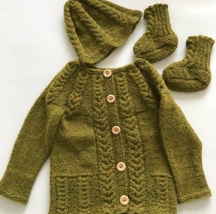The handmade baby set has a cable pattern and is knit in a luxury alpaca yarn. The cardigan has cables up the front, a cabled yoke and a cable section at the bottom. It fastens with mock wooden buttons, The hat is a beanie style with cables and the sock like bootees have a cable pattern at the front. The yarn is really soft and is an unusual green and gold mixed colour.