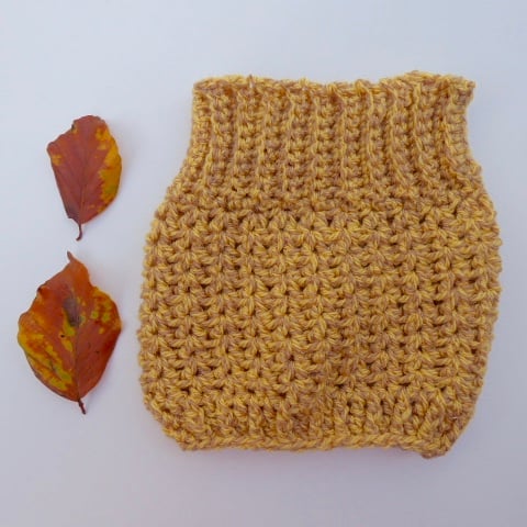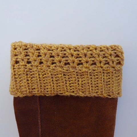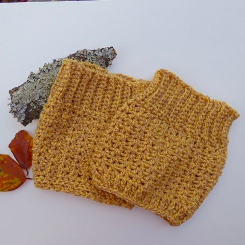 Crocheted in a mustard twist yarn, they have a V pattern in the main cuff and are finished with a 5cm (2 inch) rib. The yarn is acrylic so it's suitable for vegans.