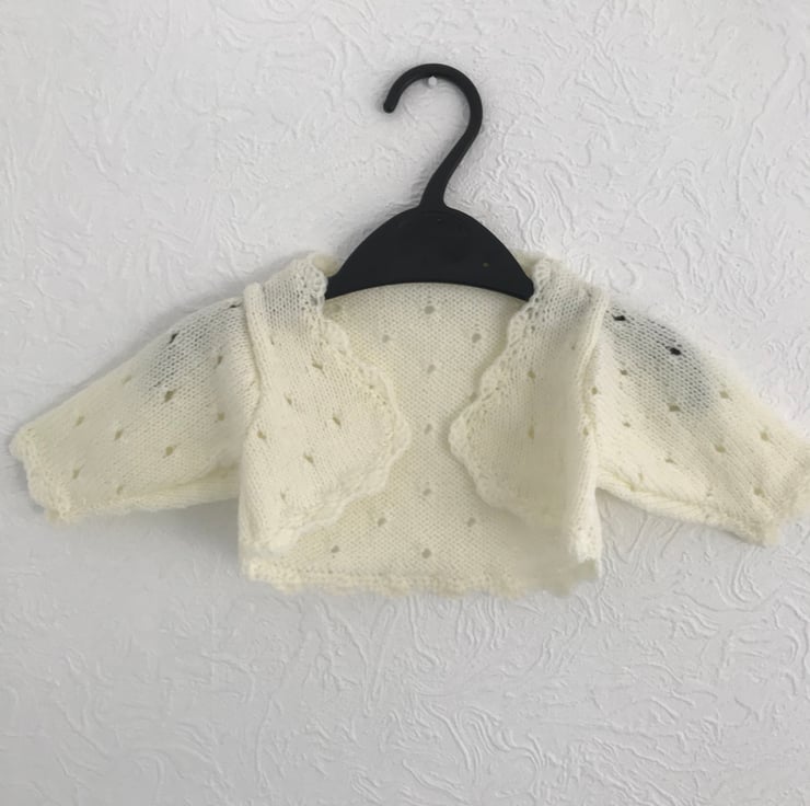 A handmade baby bolero knit in a soft baby yarn. It has an all over pattern and a scalloped edge. The yarn is a 4ply so it is not too thick.
