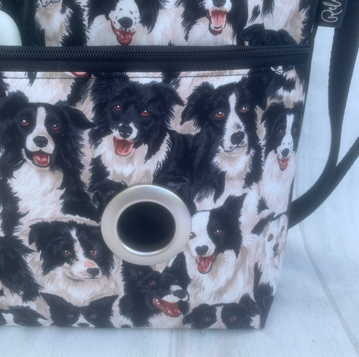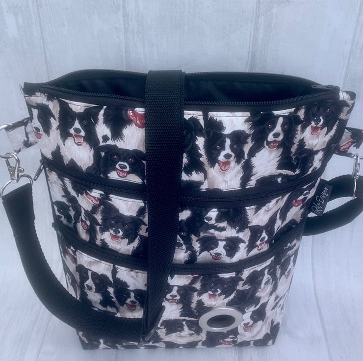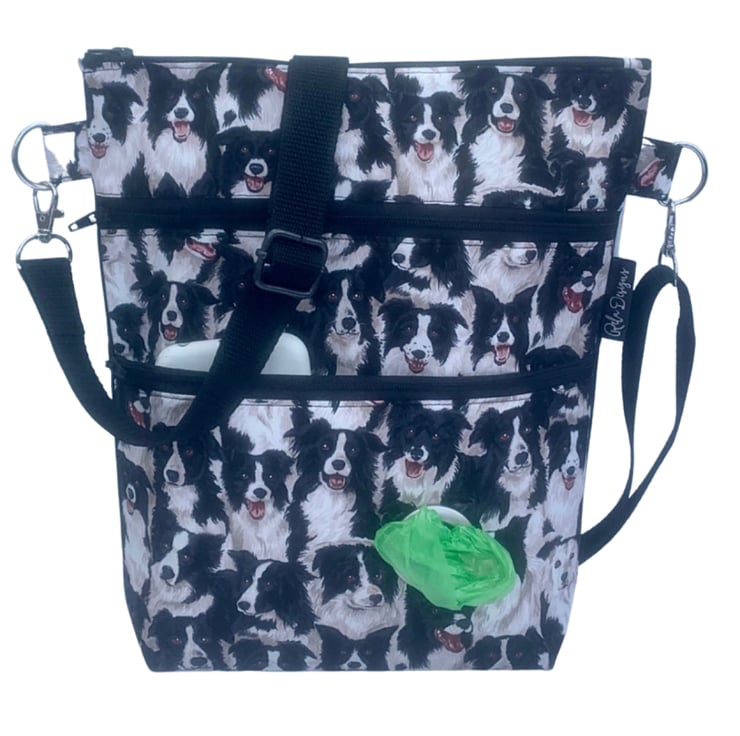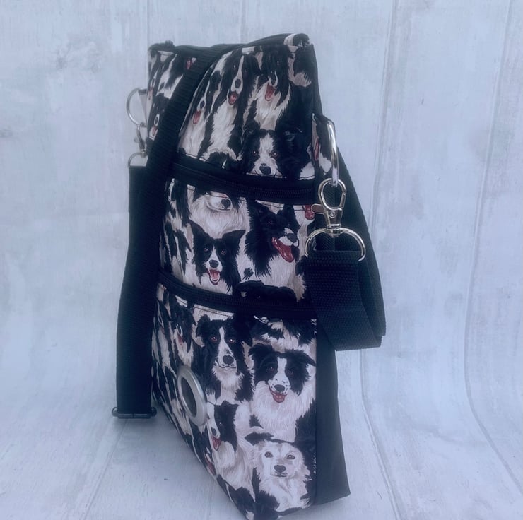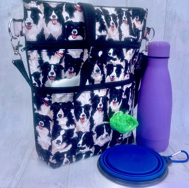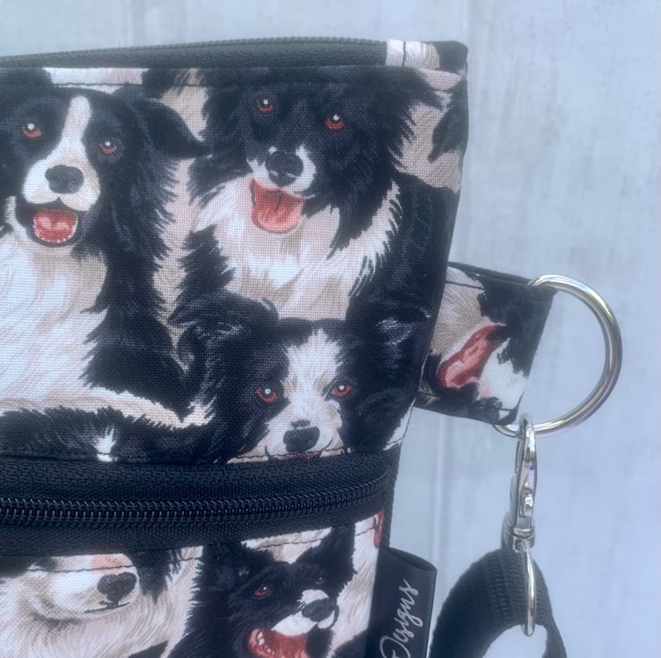 This Border Collie cotton print cross body dog walking bag has a plain black waterproof nylon canvas back and is lined with a black waterproof nylon lining. This handy bag will hold all your essentials for walking your dog.