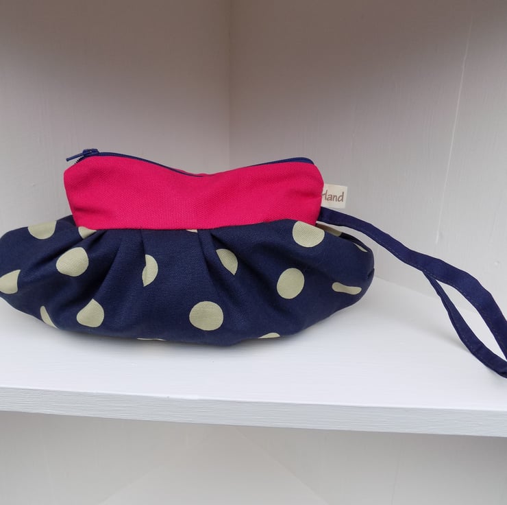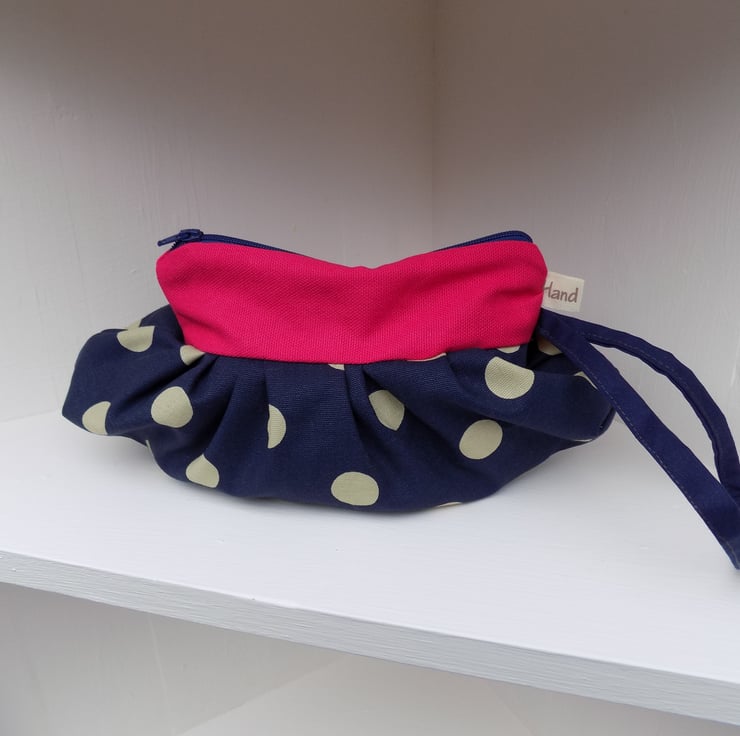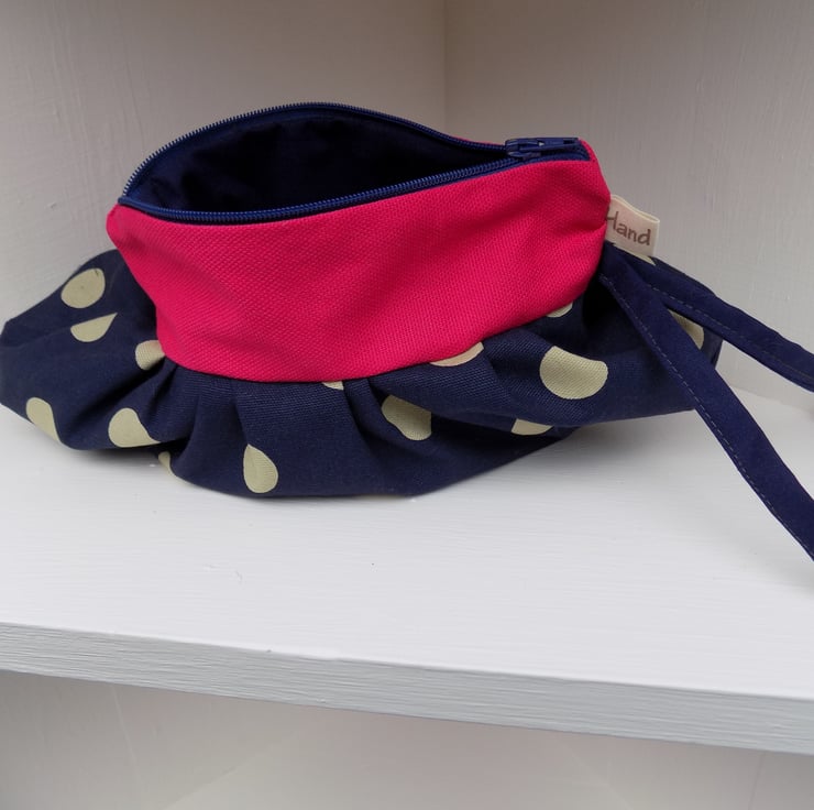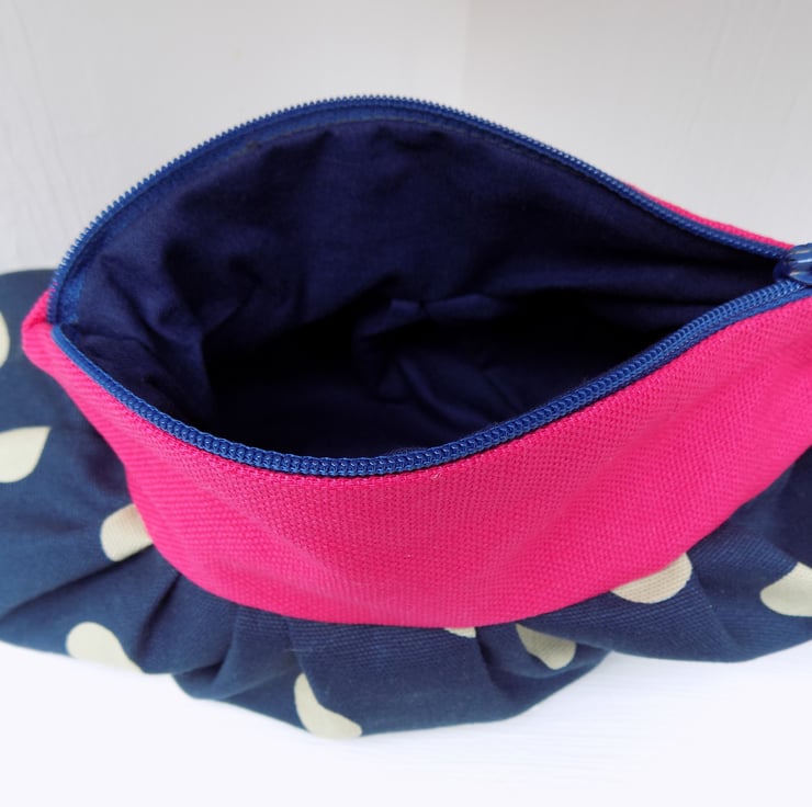 Handmade in Shropshire by me, from navy blue heavy weight cotton with cream polka dots and a lovely contrasting heavy weight hot pink cotton.