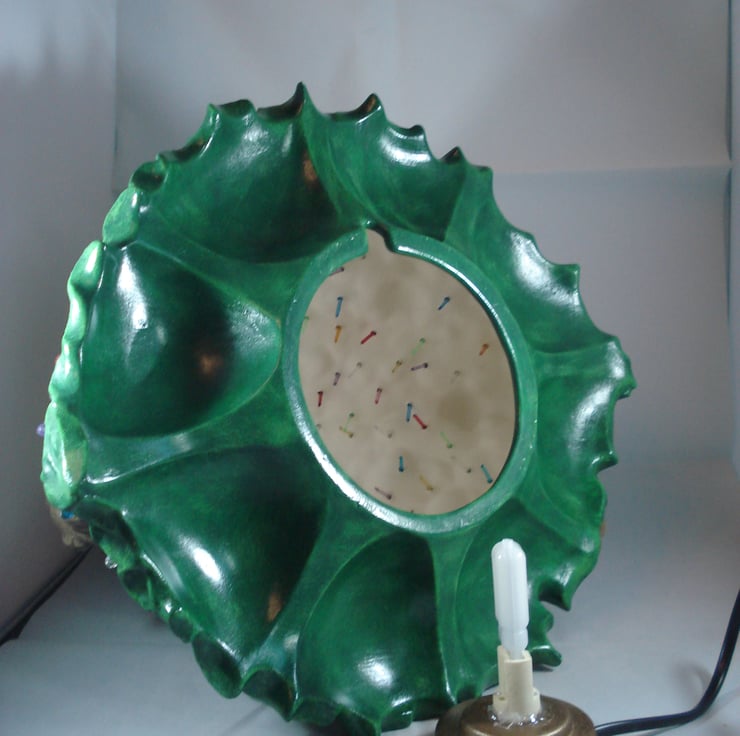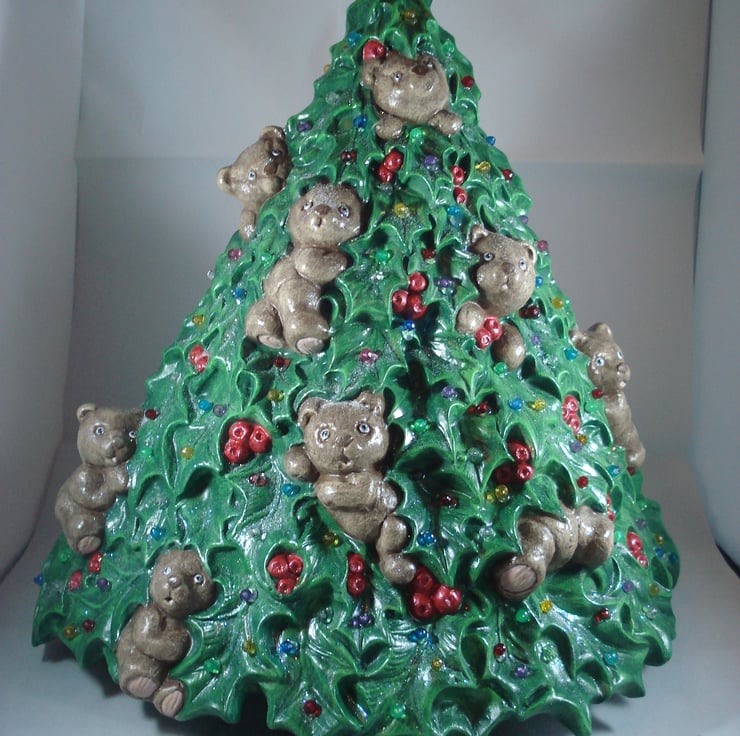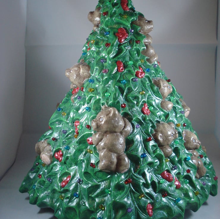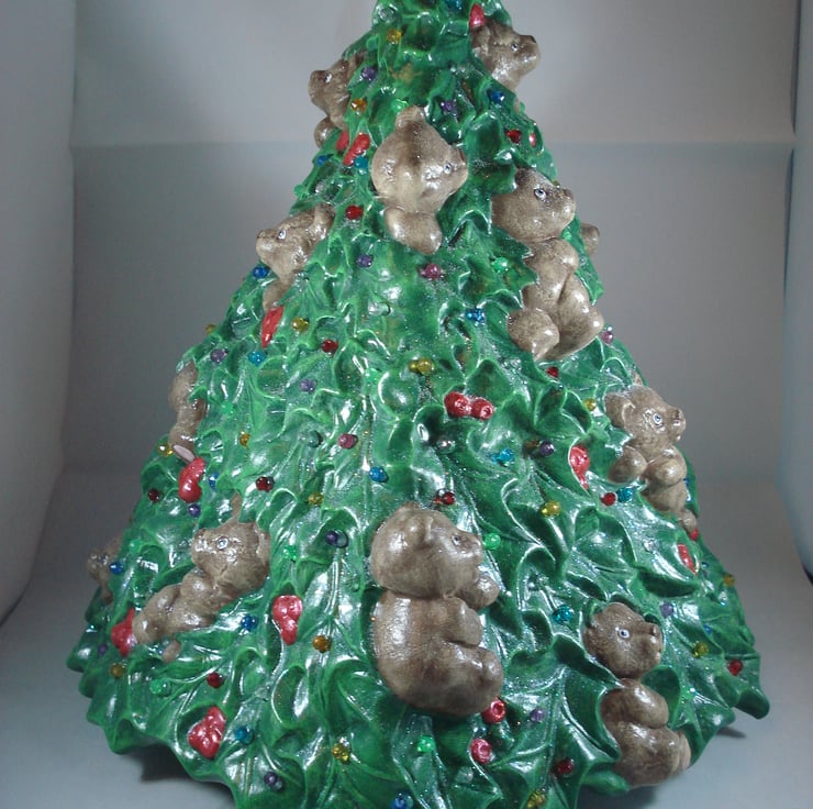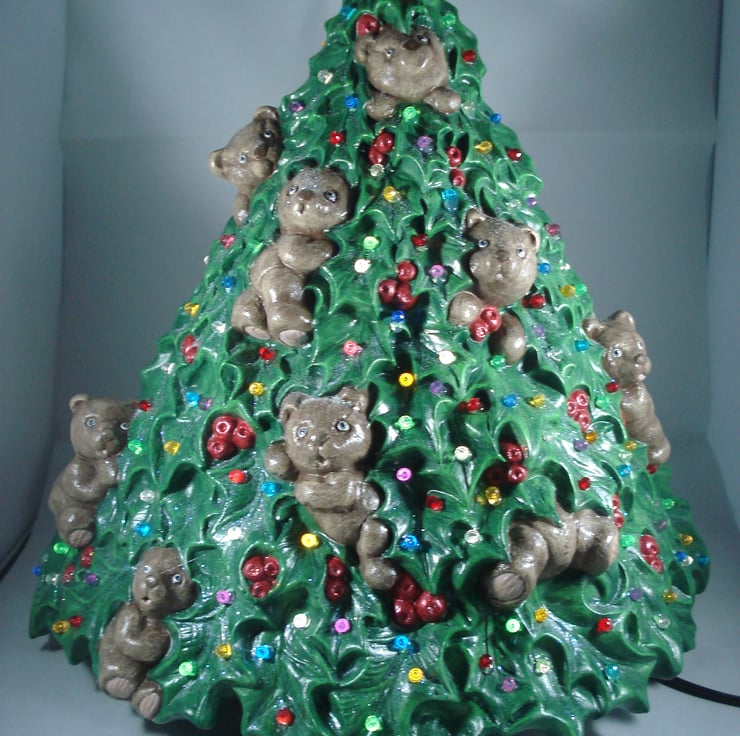 I have for sale a ceramic Christmas table lamp, which was hand painted by myself. It is a large green, glittery Christmas tree, which is in a green holly leaf and red berries design, with small brown bears crawling all over it. The tree also has numerous very small plastic lights, in a variety of different colours. The small ceramic base is completely separate and contains the electrics, the tree is placed over the top of it. Included in the sale is a free G9 LED bulb. PLEASE NOTE: the plug will be supplied, but it will not be fitted. This would make a lovely addition to anyone's Christmas decorations, or perhaps given as a gift.