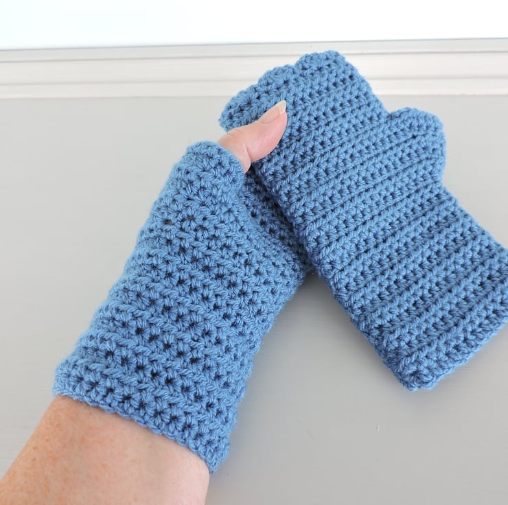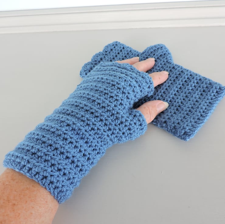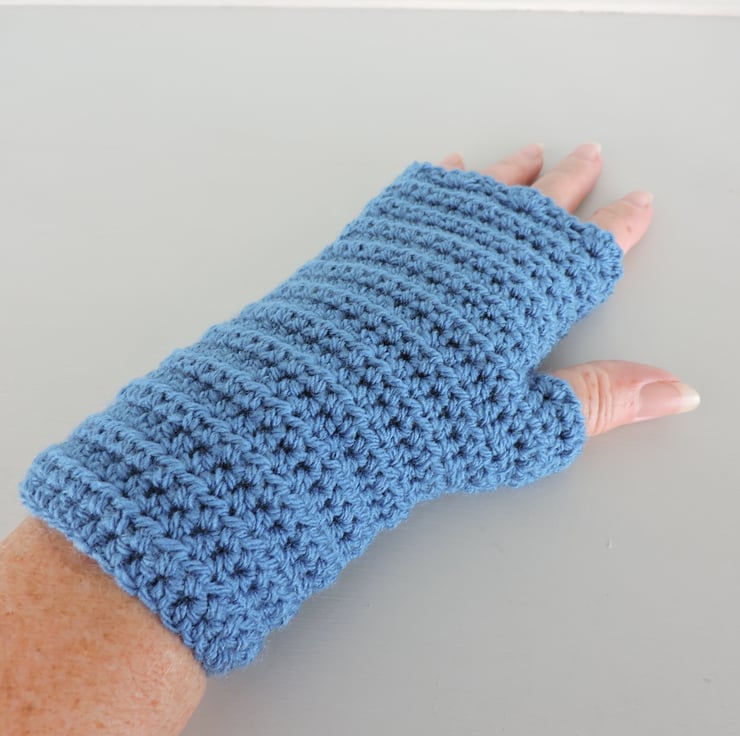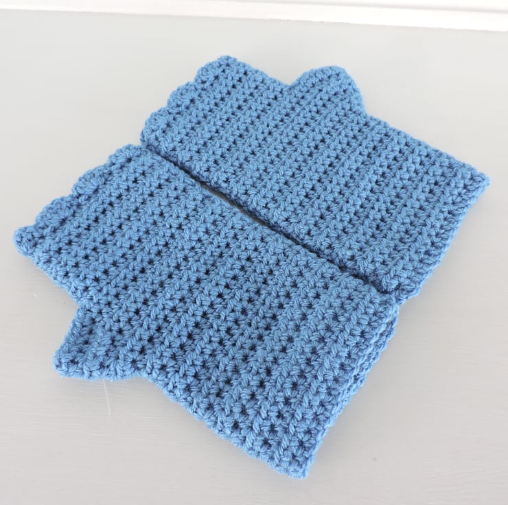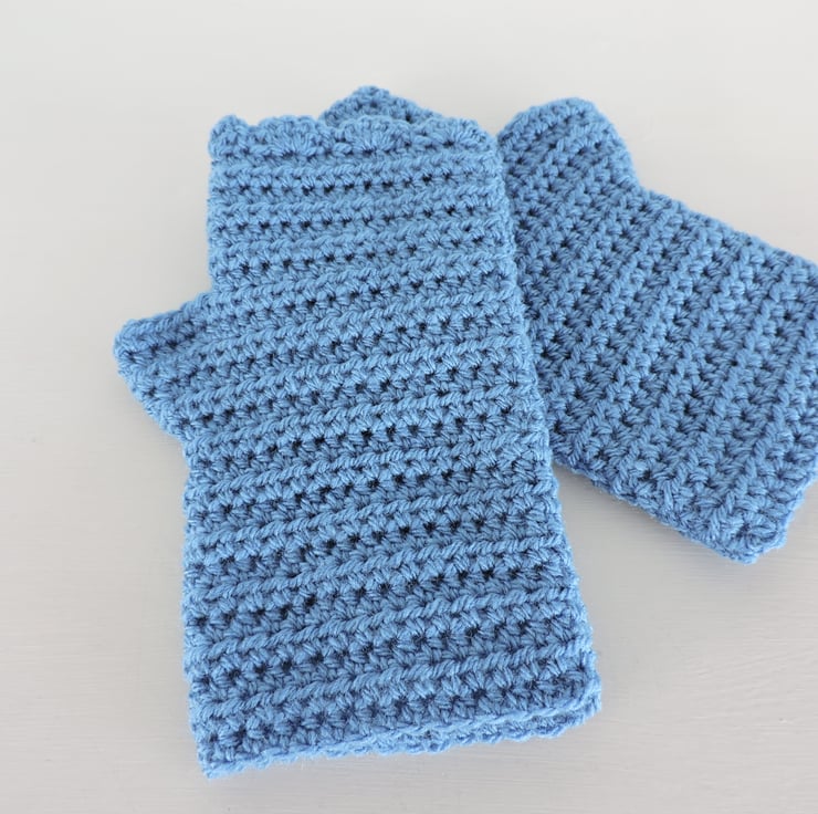 These sky blue fingerless mitts, wrist warmers, gloves have been crocheted using a soft 100% premium acrylic yarn. They have a simple plain body with a wavy edge top .