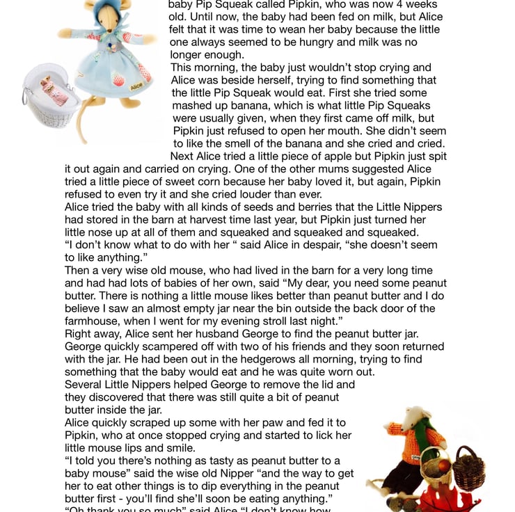 Little Nippers are a community of little mice, who live in the barn at Mulberry Farm. They are sometimes very hard to spot - but they are always there. Don't forget, next time you are out, keep your eyes open and you may just see a Little Nipper scurrying about.