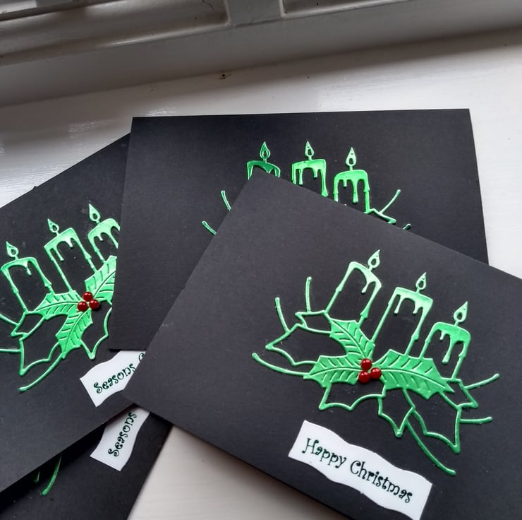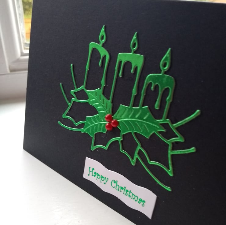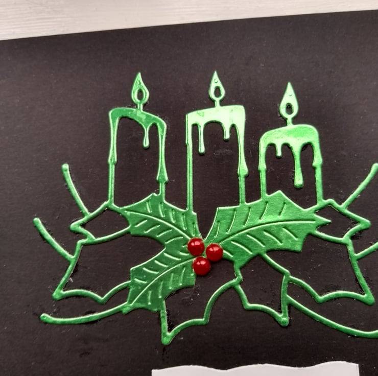 A completely handmade and uniquely designed pack of 4 same design and colourway cards. Consisting of a row aof candles and Holly die cut from green mirri card and mounted onto quality black card. Finished off with beads and festive tag.