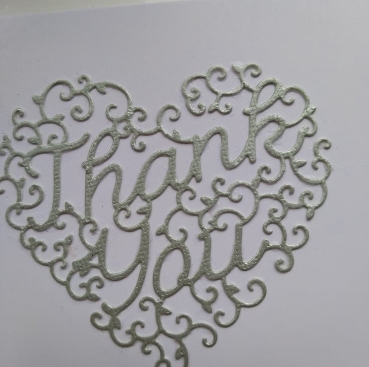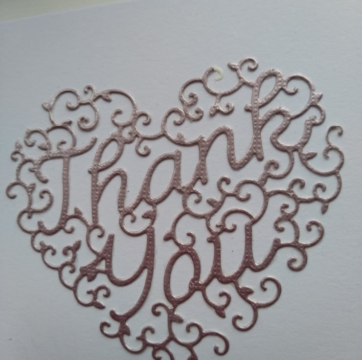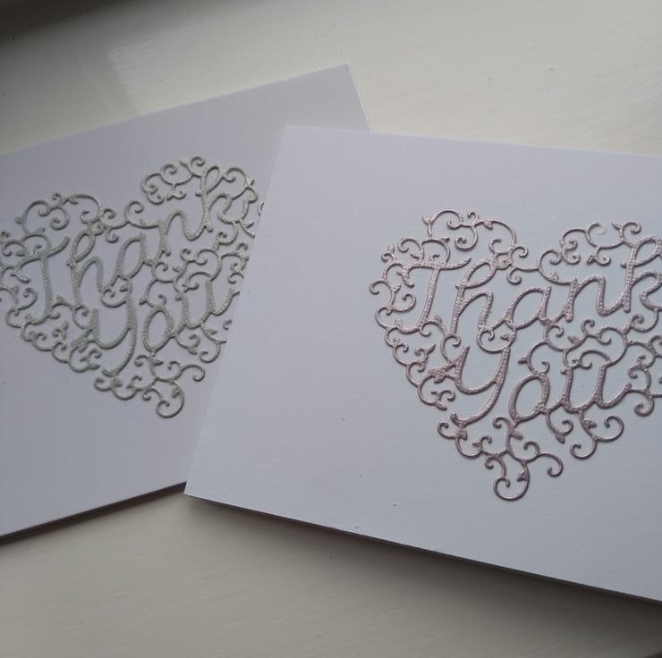 A completely handmade and uniquely designed pack of 6 cards. Same design, two colourways. 3 are dusky pink pearl and 3 dusky pale blue. Consisting of an intricate swirly heart with thank you entwined within the design die cut from pearl card. Mounted onto pristine white quality card.