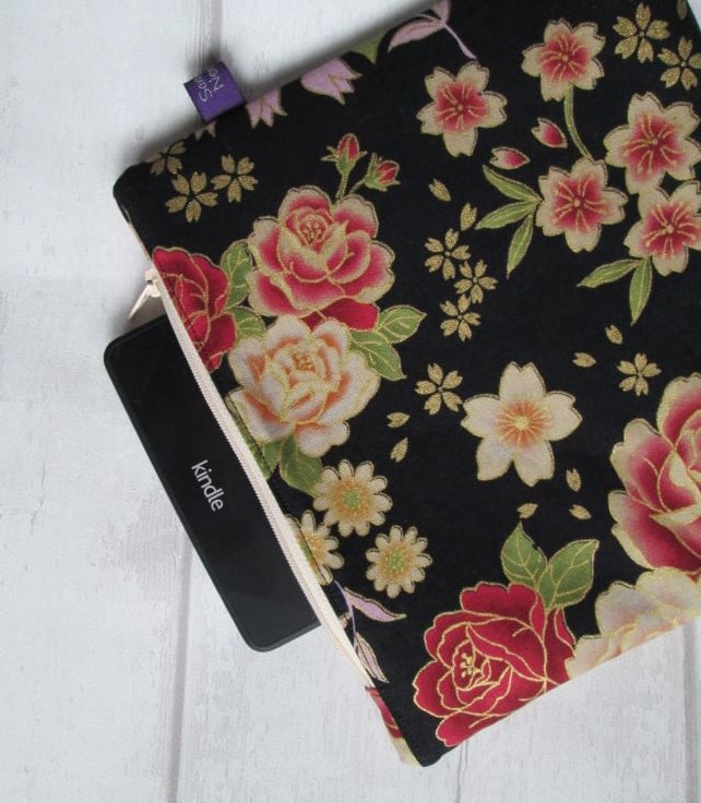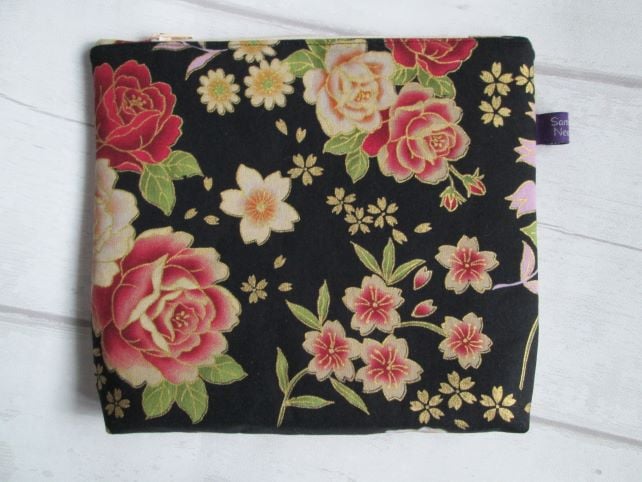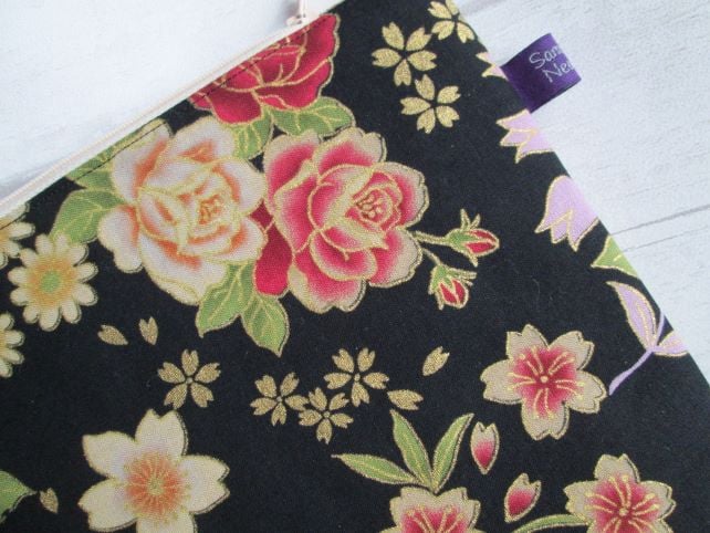 This zip top bag is made with a sumptuous, vintage style print, featuring beautiful roses in blush and deep pink, and an assortment of smaller flowers on a black background. Each flower is picked out in metallic gold to give a really rich effect. I've used fusible fleece interfacing to give the bag structure and added a cream zip and black cotton lining. The base of the bag has been flattened to give a little more room.