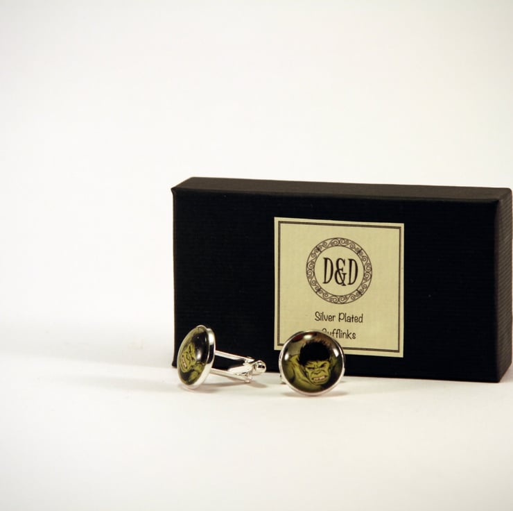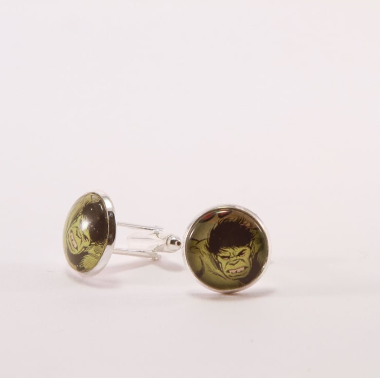 These cufflinks have a picture of Hulk, within a glass and silver mount.