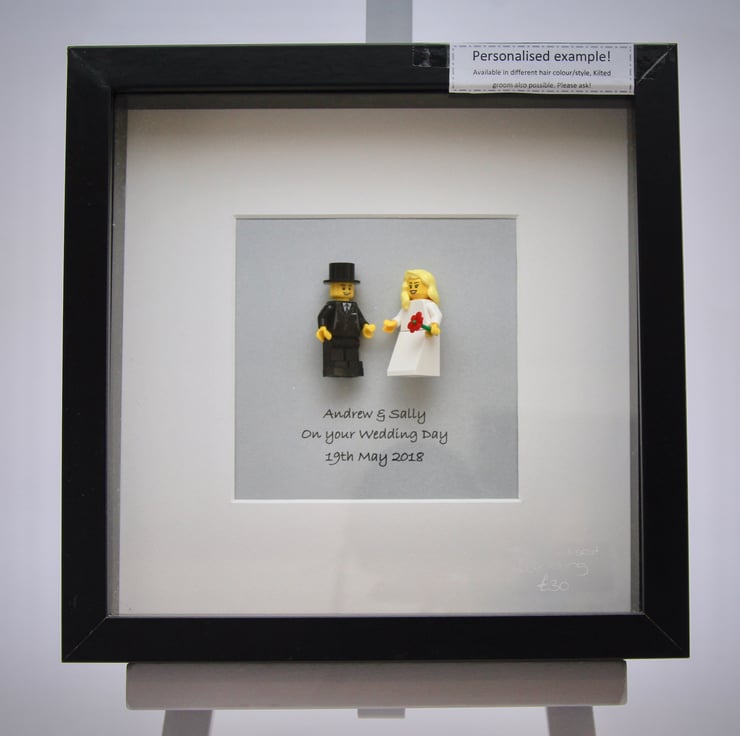 A custom custom mini figure picture of a Bride & Groom which makes a very affordable wedding gift.