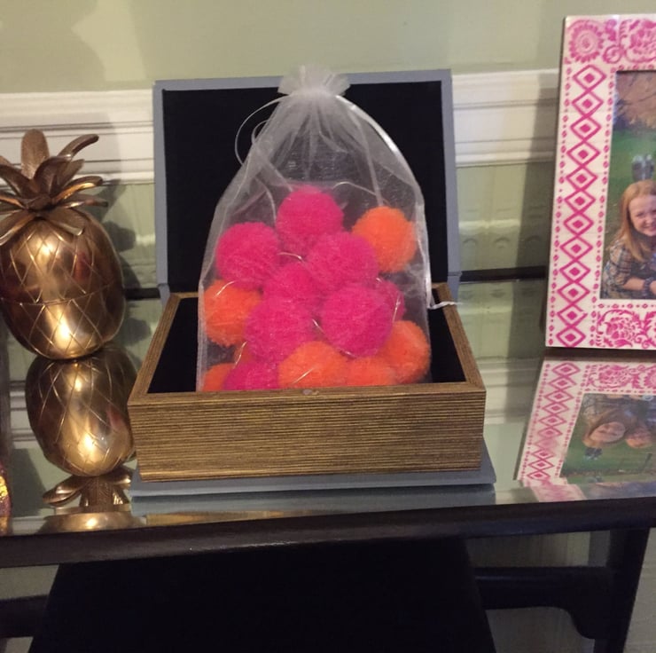 A set of 20 pom-pom LED lights containing hot pink & bright orange pom-poms.