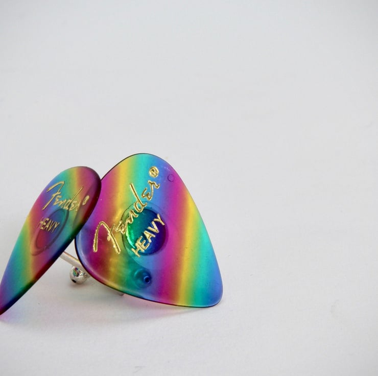 A pair of silver plated opaque rainbow Fender plectrum Cufflinks .