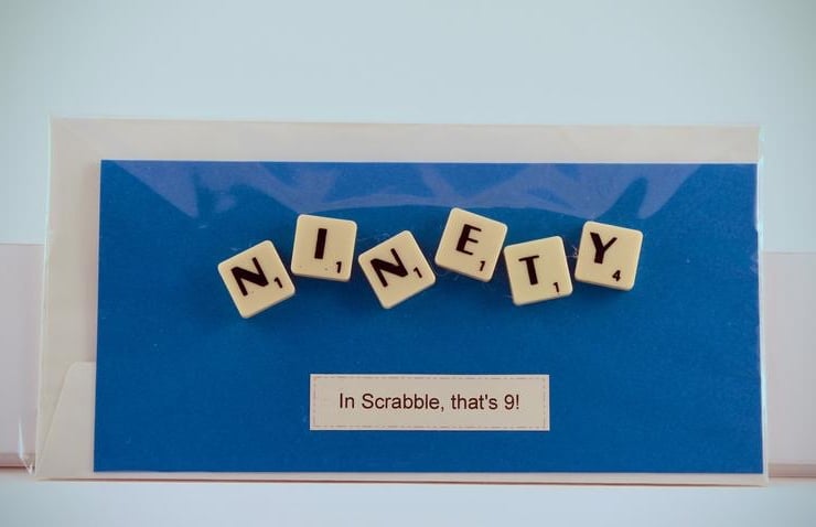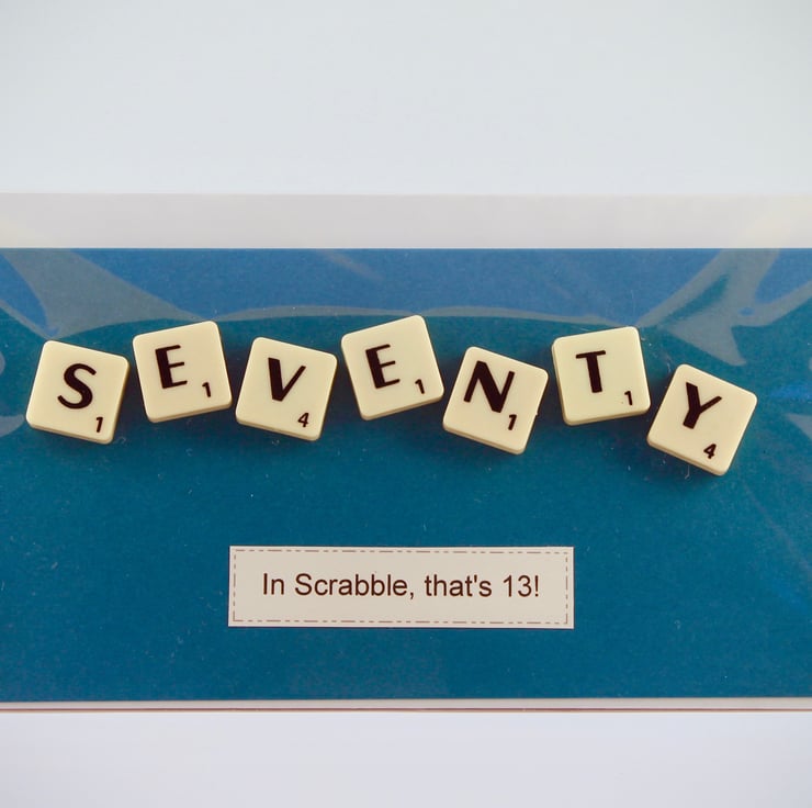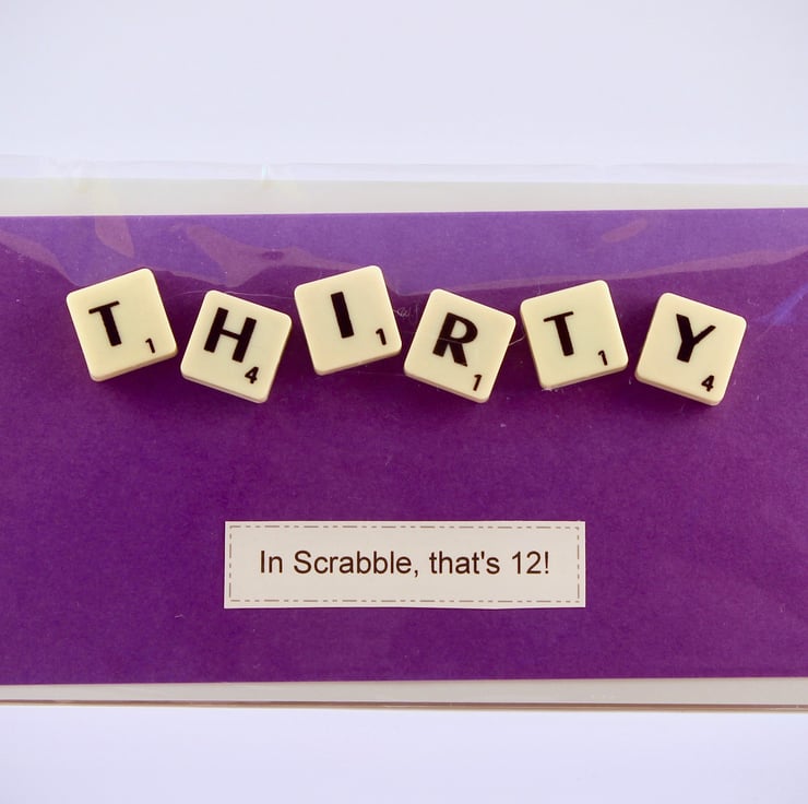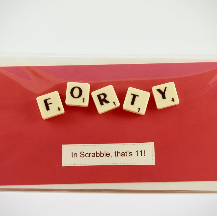 Each card adds up the scrabble tile score and tells you the age in scrabble, a nice touch for someone not looking forward to their big birthday age!