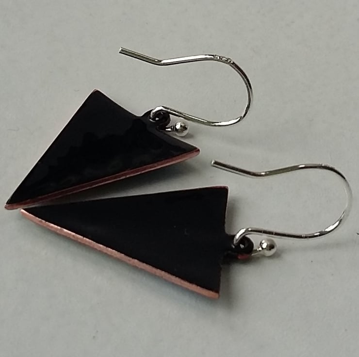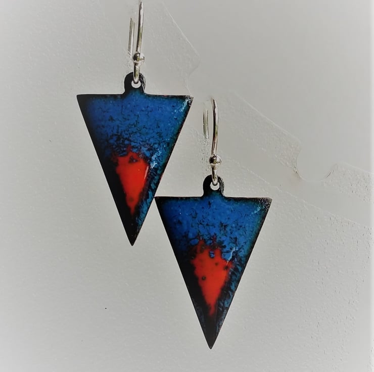 A pair of beautiful triangular copper earrings in shades of blue with a colour pop of orange. The earrings have been kiln-fired and each measures 25mm from top to tip and 17mm across the widest part, and come complete with sterling silver earring wires. The backs have been finished in glossy black enamel. They are supplied with a little organza pouch and POSTAGE IS FREE!