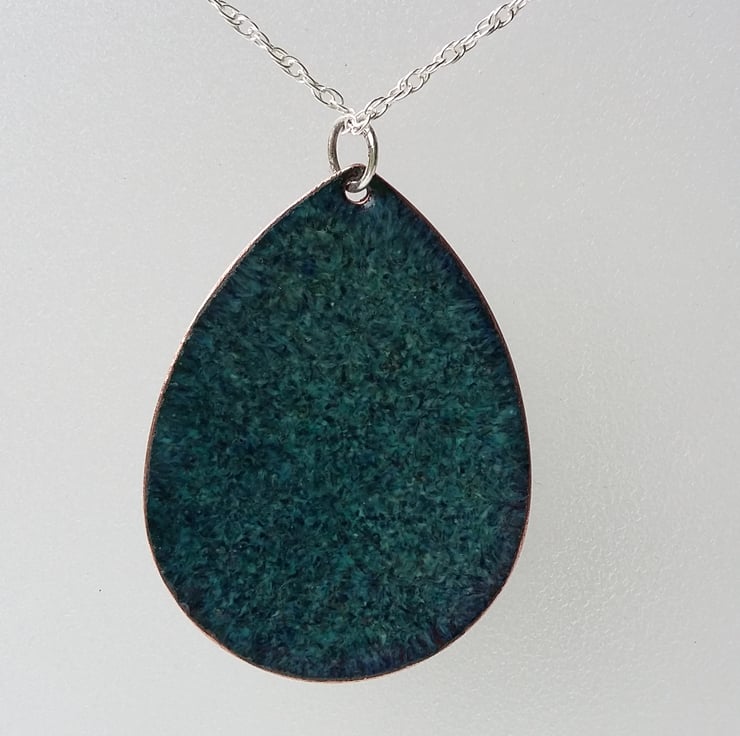Large teardrop shaped enamelled copper pendant in tones of blue. The pendant has been kiln-fired and measures approximately 40mm long and 33mm wide at its widest point. To complete the piece aesthetically and for a smooth finish against the skin, the back has been given two coats of dark blue tweed-effect enamel. It comes complete with an 18” sterling silver rope chain with a soldered sterling silver jump ring and is supplied with a little organza pouch. POSTAGE IS FREE!