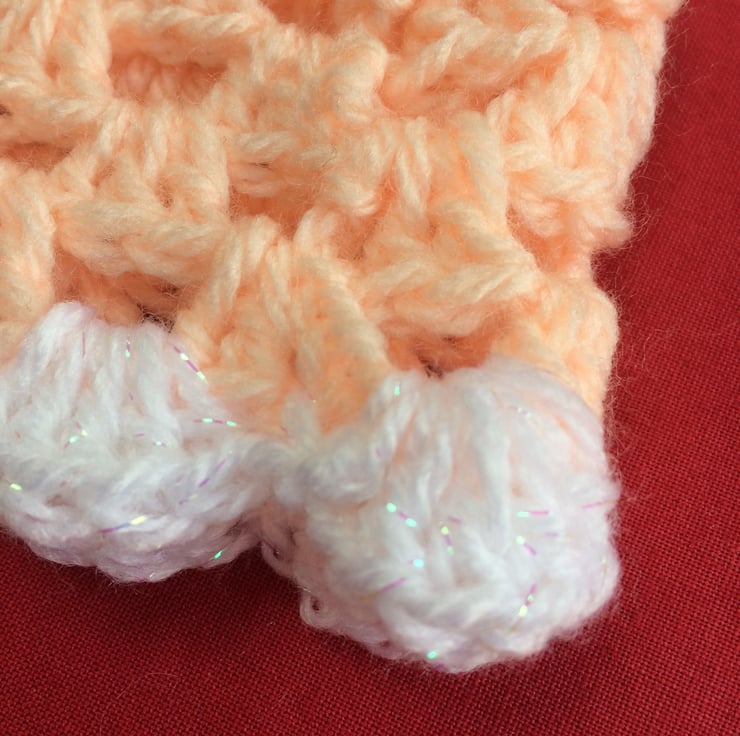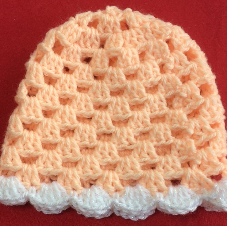 The main colour is peach / apricot and the edging is done in a sparkly white. It's a really pretty hat for the winter months.