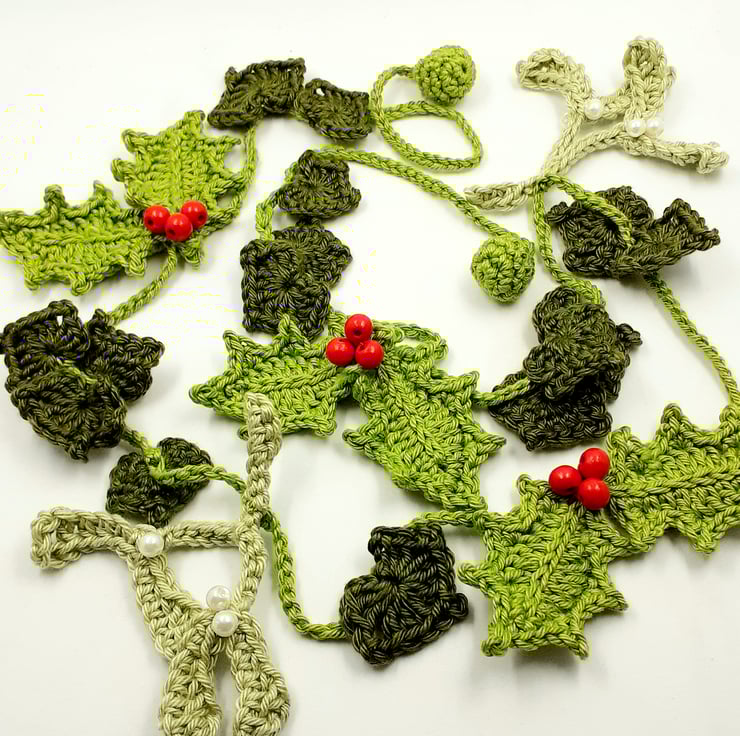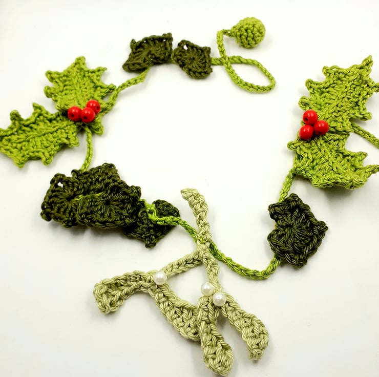 This festive garland measures approximately 112 cm long and features sprigs of holly, mistletoe and ivy. The holly berries are brightly painted wooden beads and the mistletoe berries are creamy glass pearls. It is finished at each end with a crochet 'bead' for easy tying.