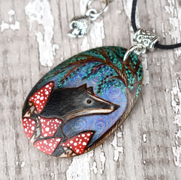 A cute badger peers from the toadstools on this teardrop pendant. Hand burned using pyrography or wood burning. Coloured with prismacolour pencils. Ideal for a nature lover's birthday or for a five year wood anniversary gift.