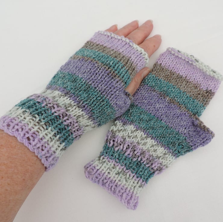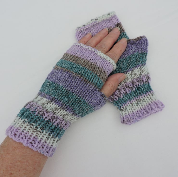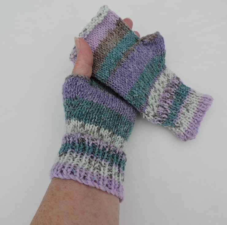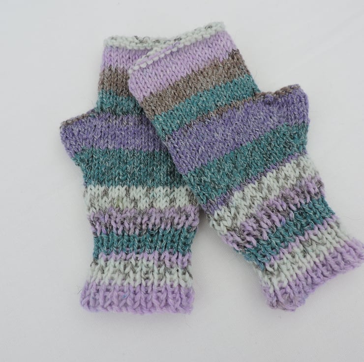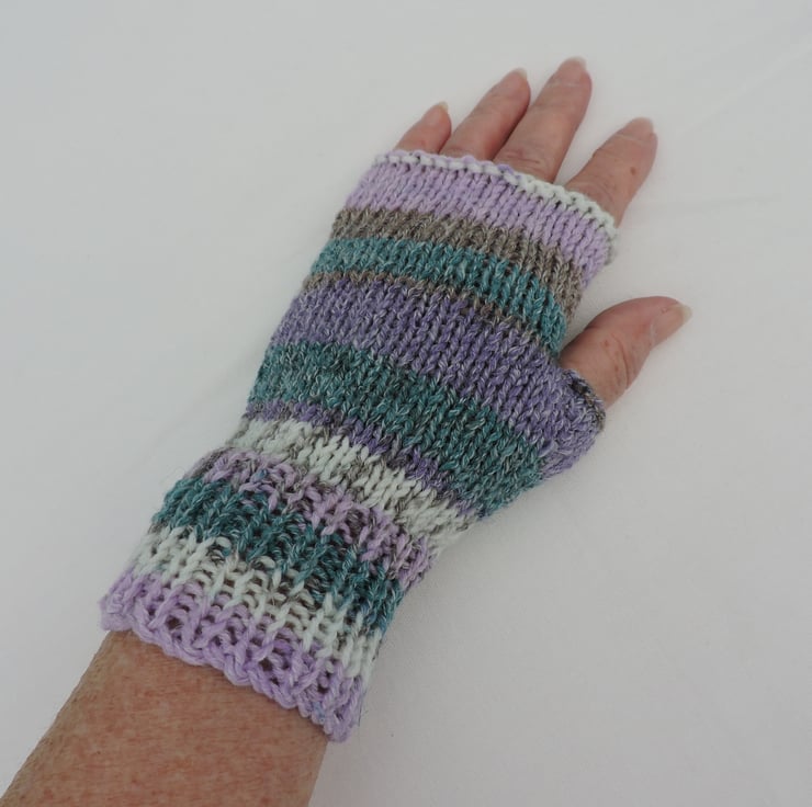 I've knitted this pair of fingerless gloves, mittens with a multi tonal Fair Isle effect acrylic, cotton and wool yarn. Teal, taupe, white, grey and lilac colours. A lovely winter warmer.
