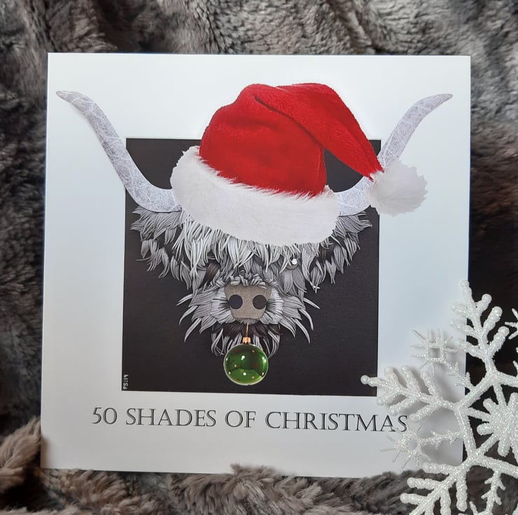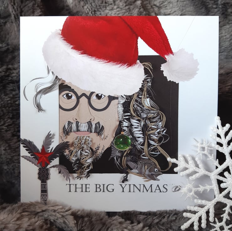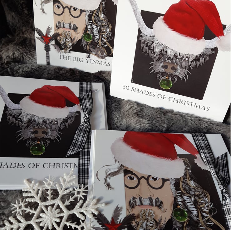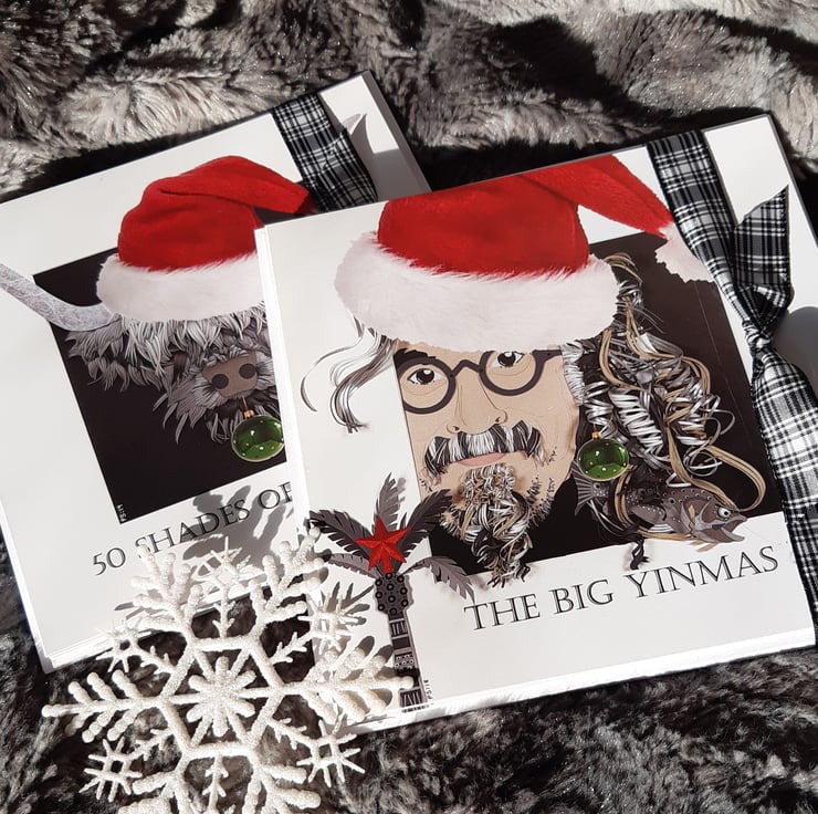 I love Black & White Christmas cards, with just a touch of colour, so my original paper sculptures of Billy Connolly & the Highland Cow were perfect for these cards.