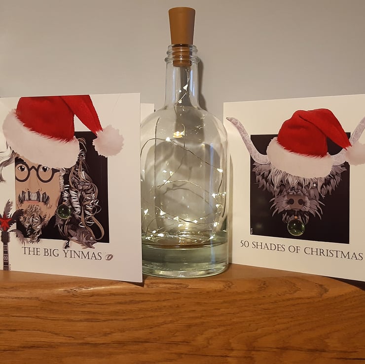 Billy Connolly's Big Yinmas & 50 Shades of Scottish Christmas on these beautiful cards by Scottish artist, Pam Scott. 4 Pack - 2 of each design, 148mm square. Blank inside with White envelopes & tied with tartan ribbon.
