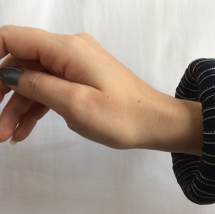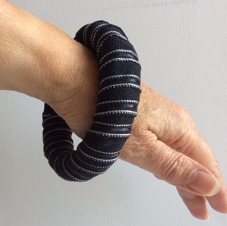 Perfect for the party season with that little black dress. This one of a kind, slip on bangle has been constructed with recycled plastic banding, wrapped and padded with fleece wadding then bound with fabric. The fabric is man made, black with a silver coloured pattern. The bangle is light, flexible and easy to wear. It would enhance any outfit.