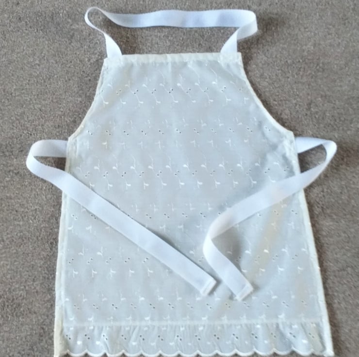 This is a very pretty feminine apron made from light polyester cotton, ivory-coloured broderie Anglaise, and with a fluted frill along the bottom edge. It has acrylic webbing straps. The pinny measures approximately 17" (43 cms.)from neck to hem, and 14" (36 cms.) at the widest point, and will fit a child from about 2-6 years. It can be machine washed.