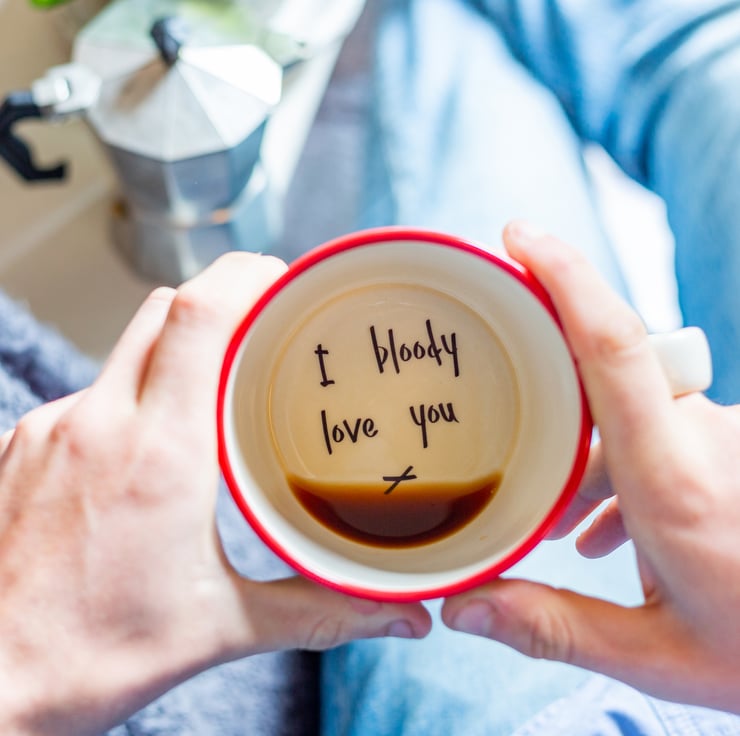 An enthusiastic declaration of love at the bottom of every cup!
