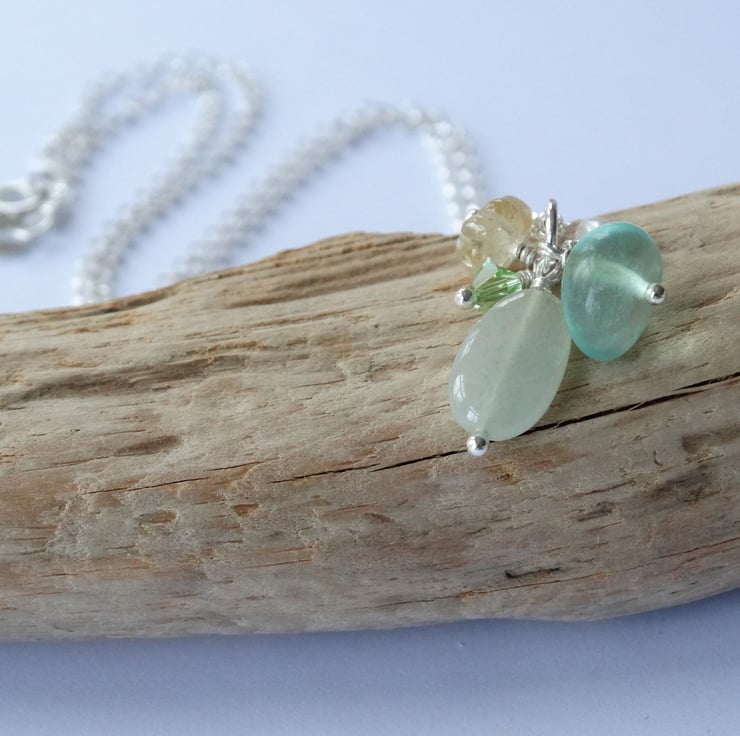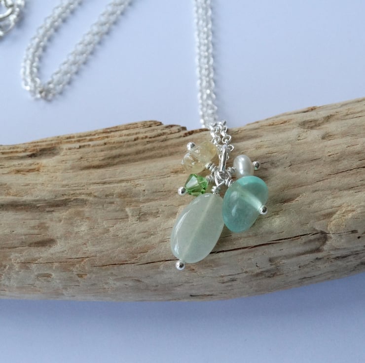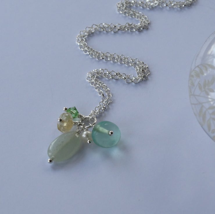 A cluster of semi-precious gemstone beads make up this pretty little charm pendant - a tiny freshwater pearl, a prehnite lozenge (approx 12mm long), an aqua coloured fluorite pebble, a little citrine pumpkin bead, and a 4mm Swarovski crystal bicone bead.