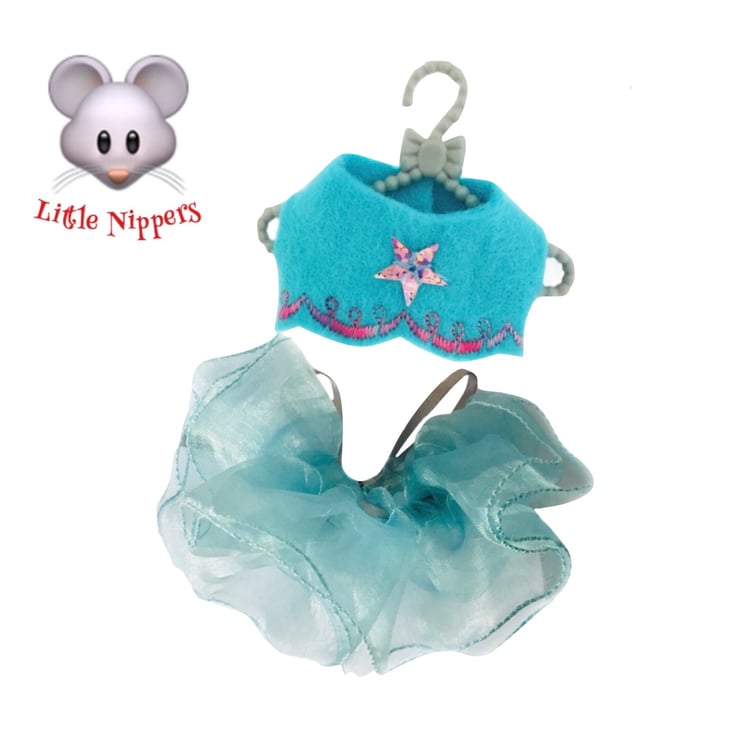 A lovely little turquoise organza skirt to fit the Little Nippers. The skirt is made from double layered organza and fastens at the back with a pretty ribbon. The matching top is embroidered and decorated with a hologram star sequin.