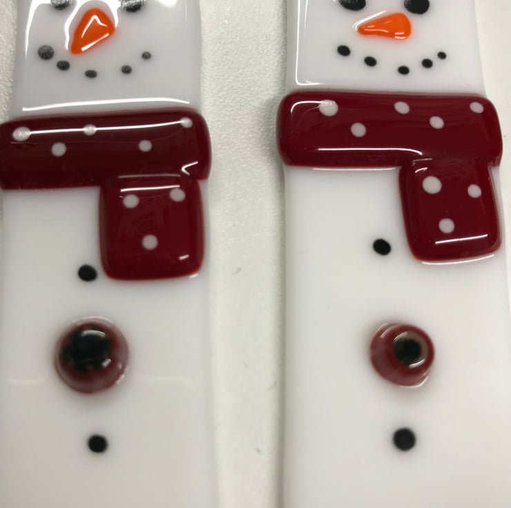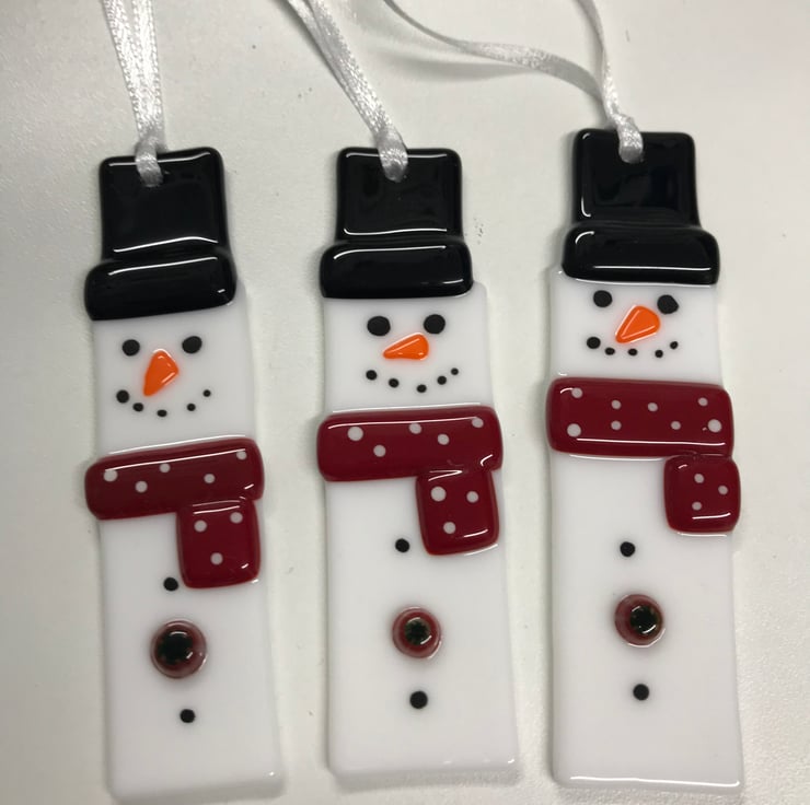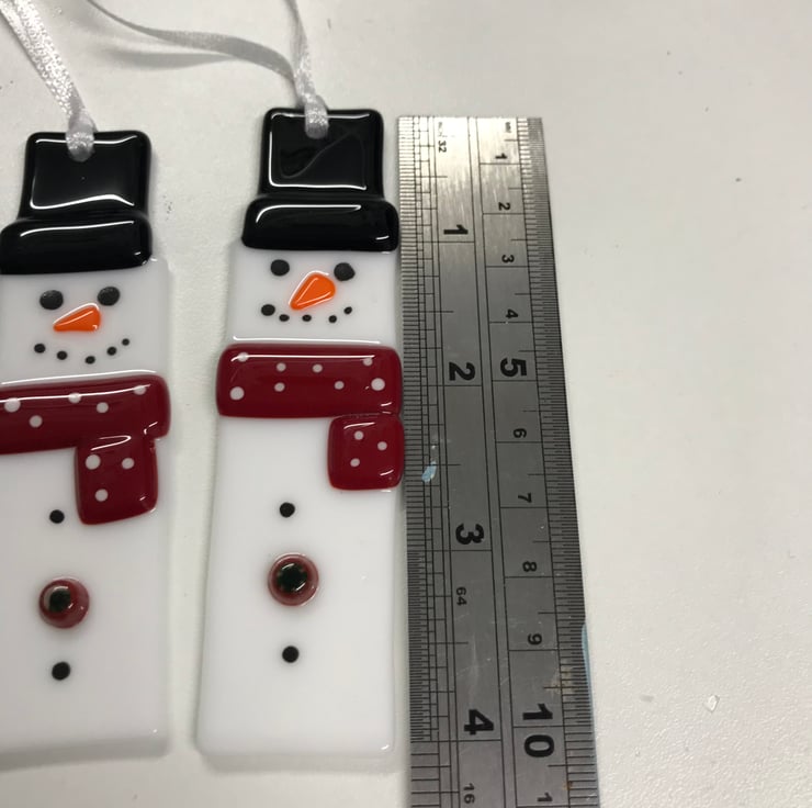 Tree hanging decoration for your Christmas tree or to give as a gift . Hand crafted glass which has been kiln fired and it beautifully glossy and tactile . Each snowman has a millifori button detail and is drilled for easy hanging . Approximately 4 inches high
