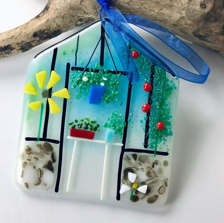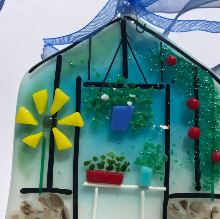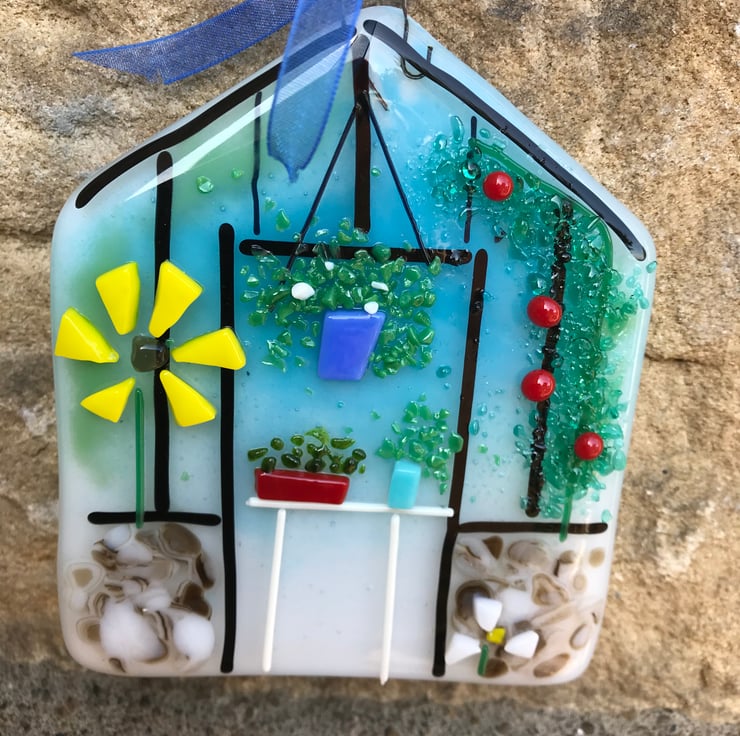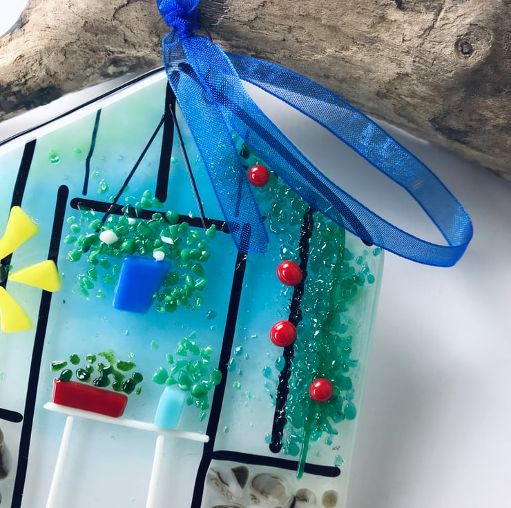 A fused glass greenhouse would make a lovely gift for a gardener or perhaps you’d like to hang it in your own green house or potting shed. Fused glass is also quite robust so provided you hang it in a sheltered spot one possibility is to hang it out outside on a wall or fence.