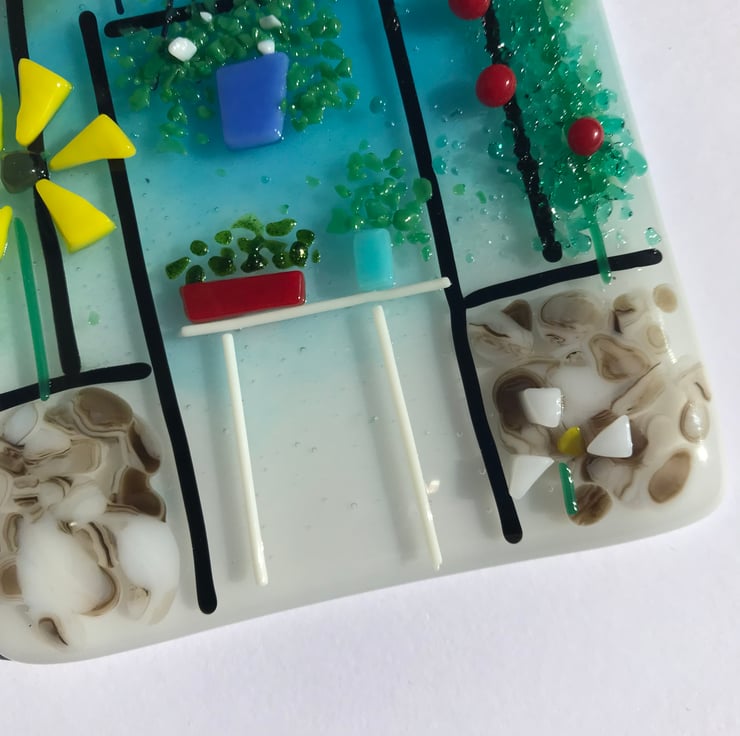 I made this from two layers of hand cut glass which I fully fused in a kiln before adding the additional details of tomatoes, potted plants etc.