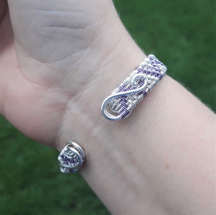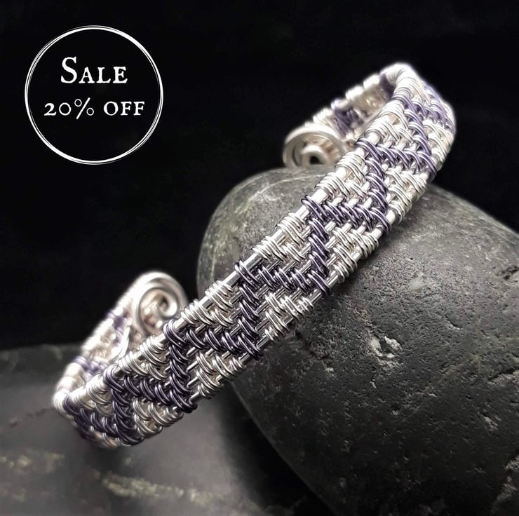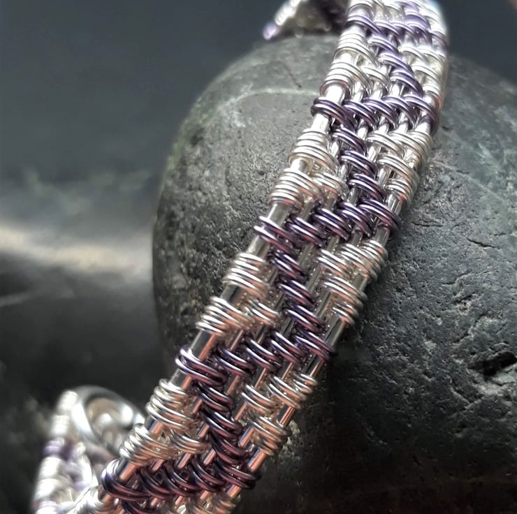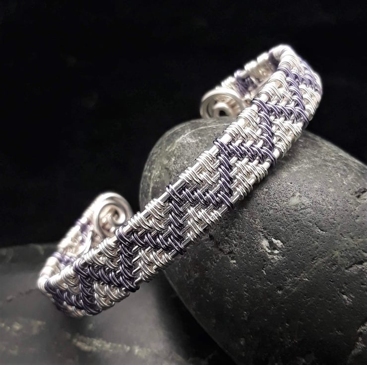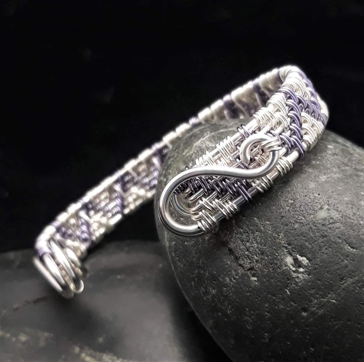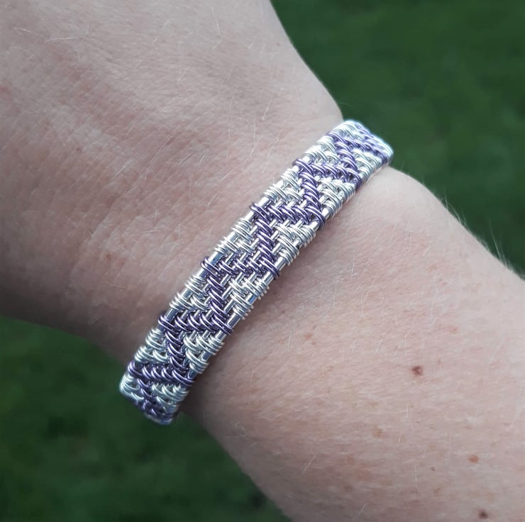 This beautiful cuff has been woven from silver plated copper wire & lilac enamelled copper wire. I've woven a zigzag around the middle of the cuff with lilac wire, & filled in the edges with silver, really highlighting the bold geometric pattern of the weave. The lilac coloured wire is quite a subtle shade & looks very pretty against the silver colour. The ends of the cuff have been finished with a swirl on the outside & a spiral to the inside - the smooth curves meaning it's comfortable & easy to slip on & off.