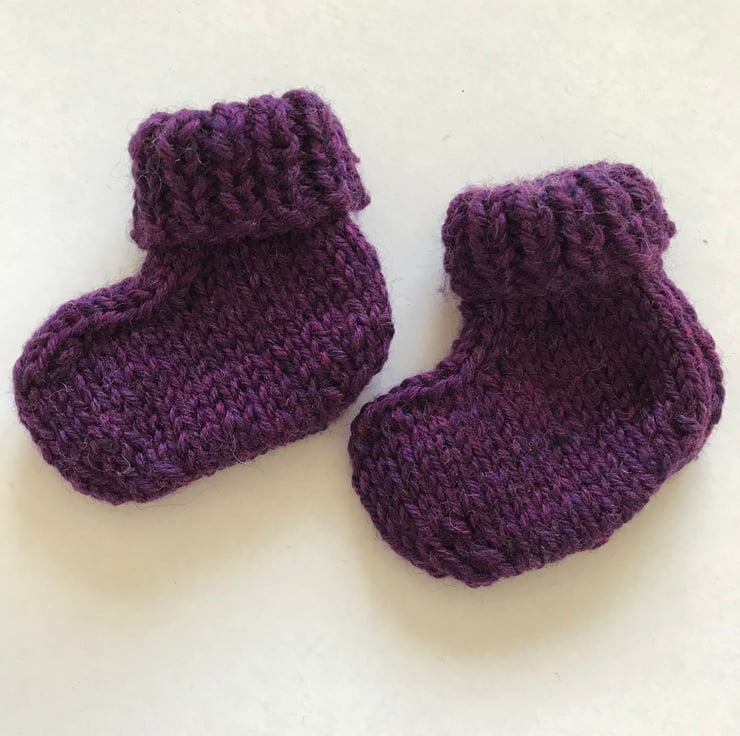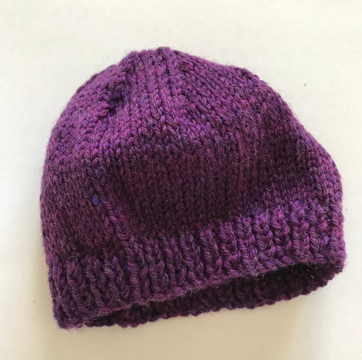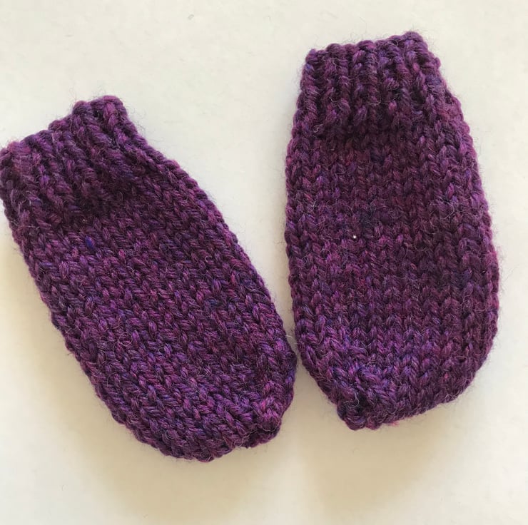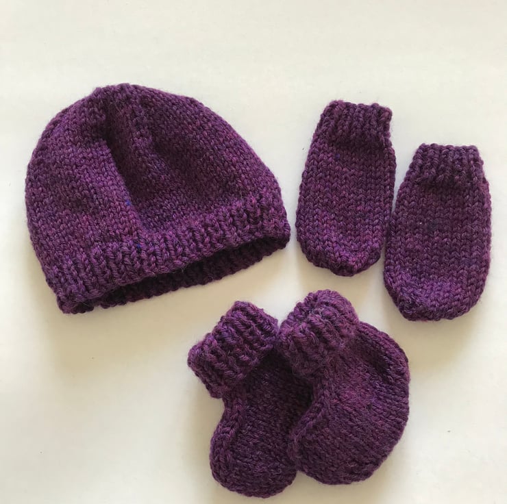 A lovely little set of hat, bootees and mitts knitted in pure wool. The pattern used is for a 0-3mth old but they have knit up quite small so please check the measurements for the actual sizes. I would say they are more suitable for a tiny baby. The wool is a mingled shade of purple.