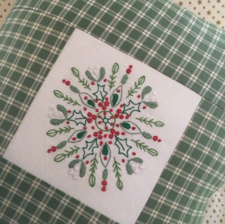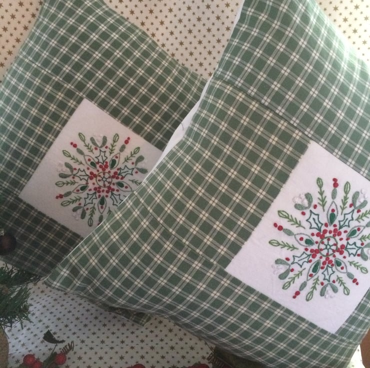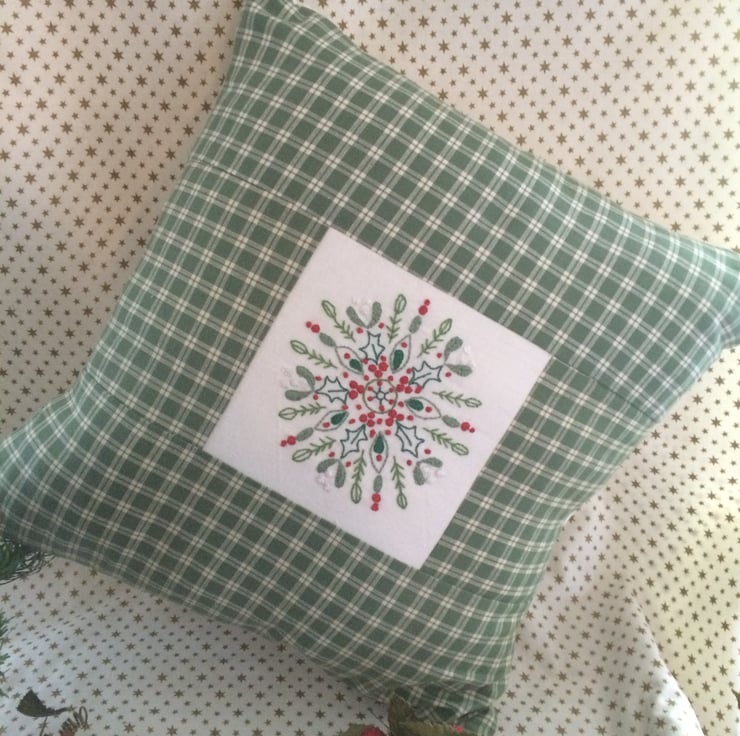 A cushion cover made with a gorgeous,soft vintage green/white check fabric. The centre panel has been hand embroidered by me on to vintage French linen.The back is made from white,vintage French linen with an envelope opening. Perfect for Christmas.