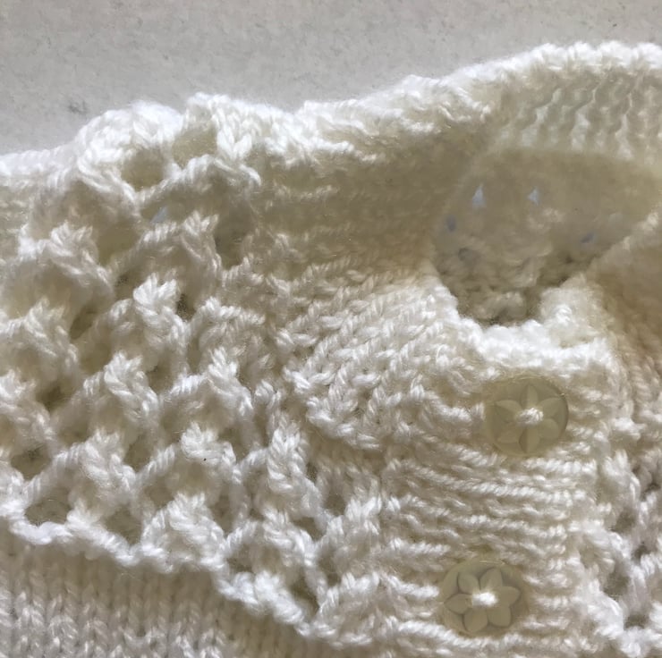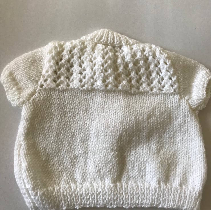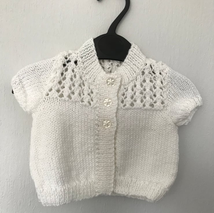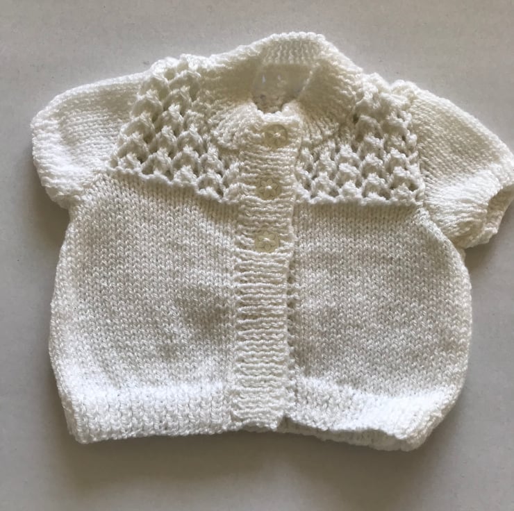 A handmade pretty little baby cardigan with short sleeves. It has a patterned yoke back and front and fastens at the top with three buttons.