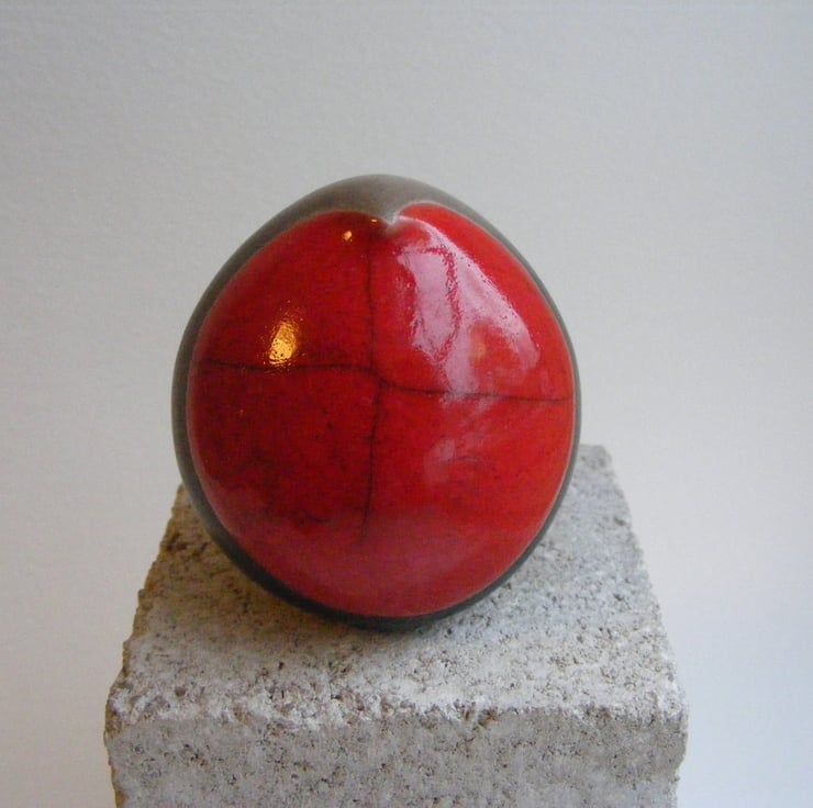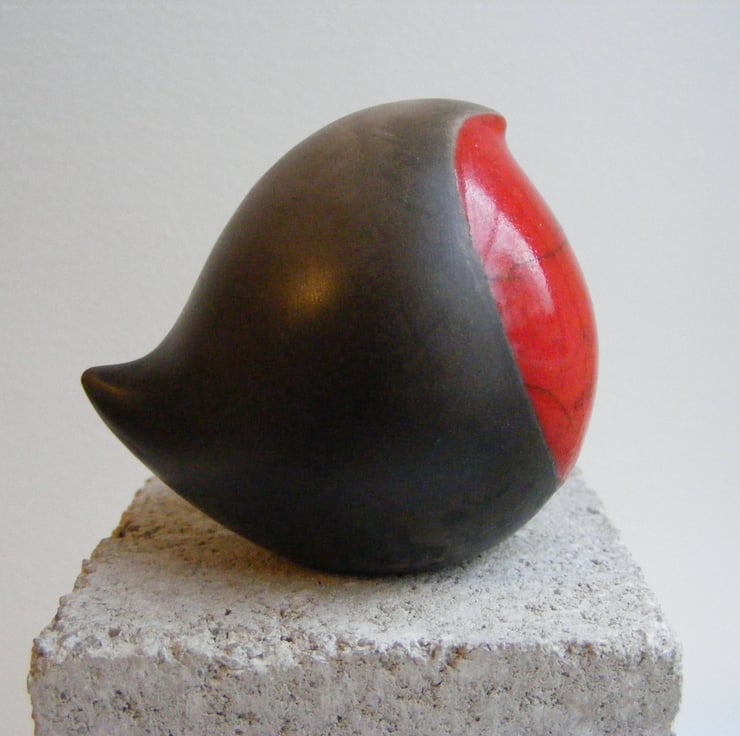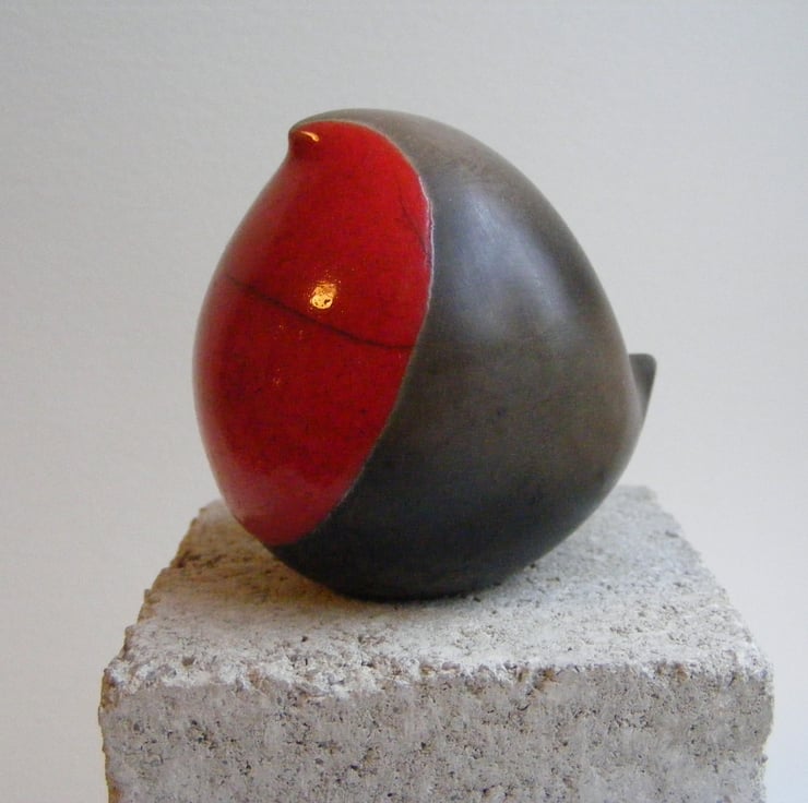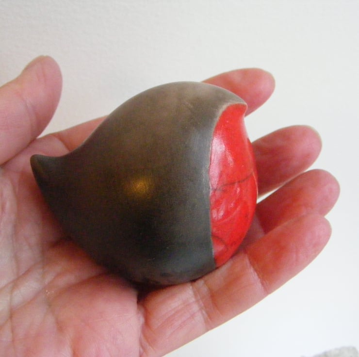 This robin is hand made and measures, 5cm high and 5.5cm long. It is made from white earthenware clay and fired first in an electric kiln then the red glaze is painted on and it is raku fired in a gas kiln, the black part of the bird has been sanded and is unglazed and polished with beeswax.
