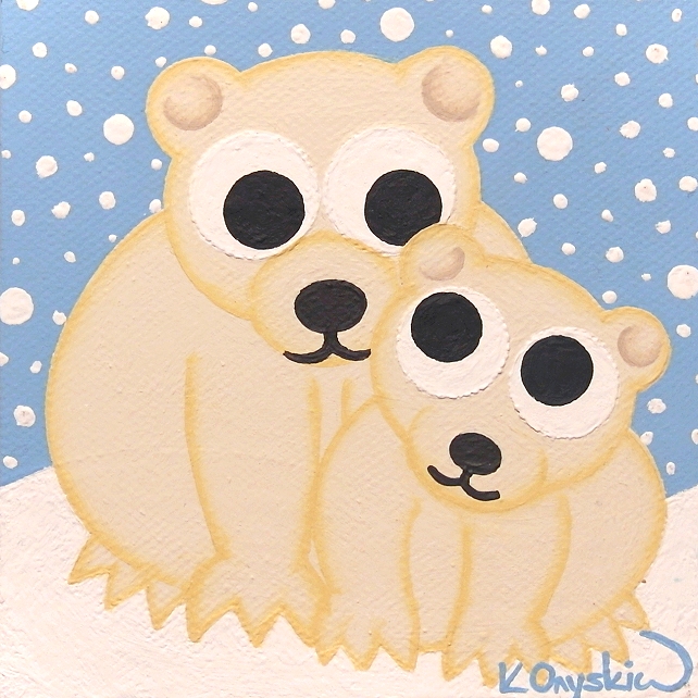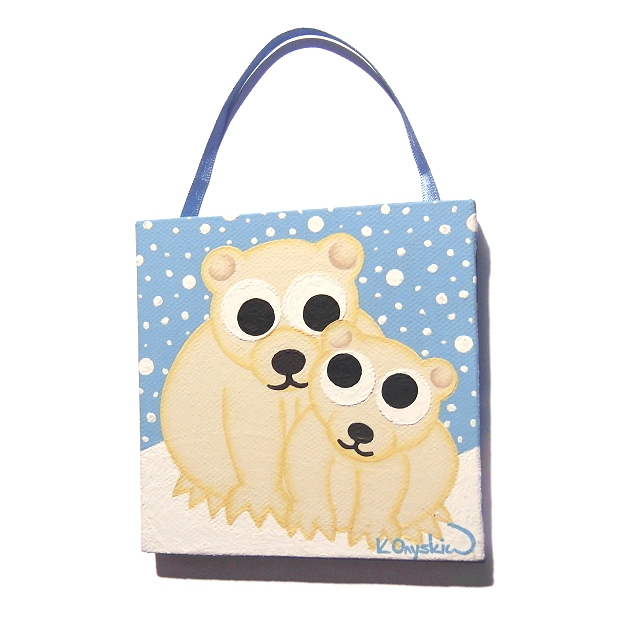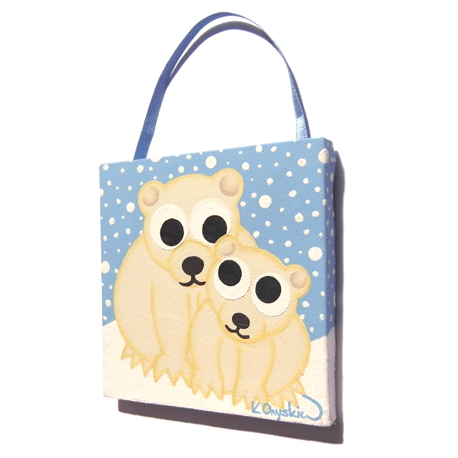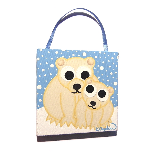 A small original painting of a cute polar bear and cub in the snow, strung on a blue ribbon.