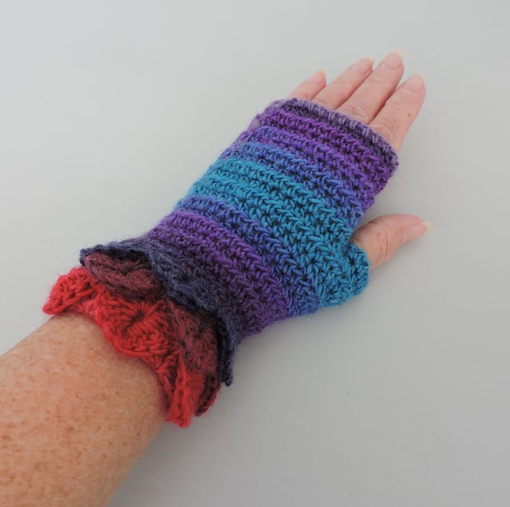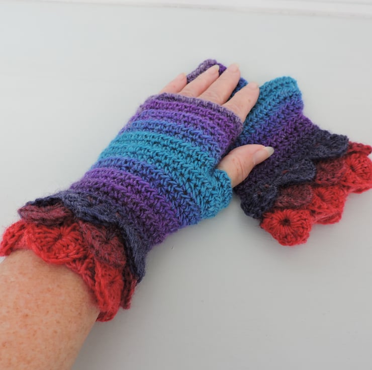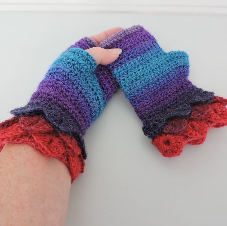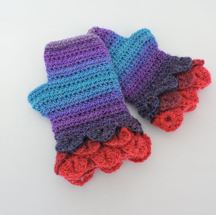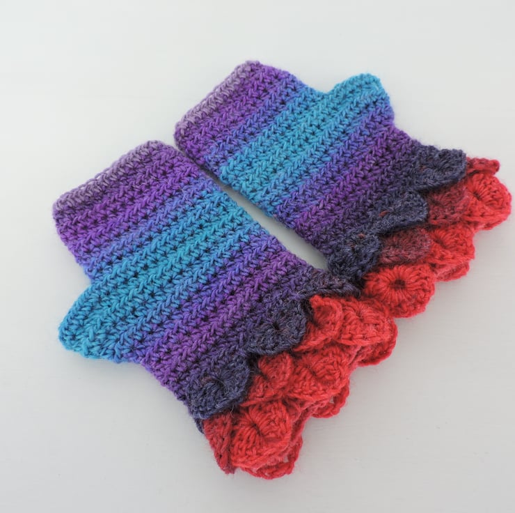 I've made these fingerless dragon scale cuff mitts using an acrylic and wool blend graduated double knit yarn. Multi tonal colours of red, blackcurrant, violet and turquoise.. They have a plain body with dragon scale cuffs. Lovely winter warmers ideal for the colder weather.