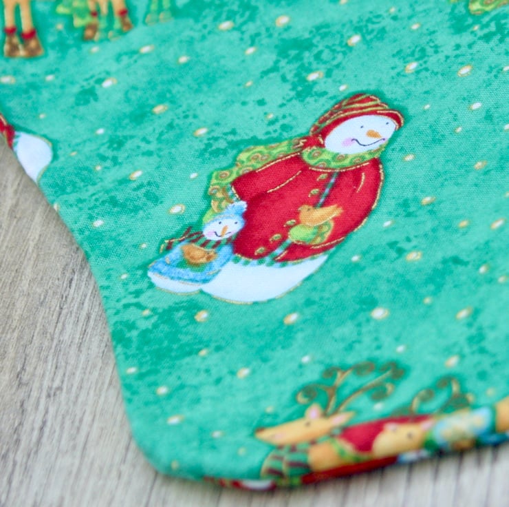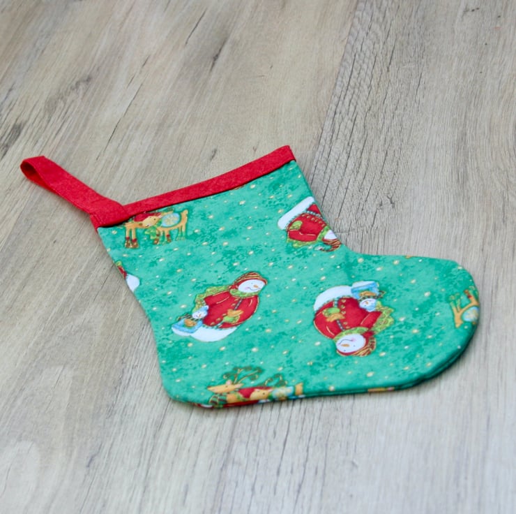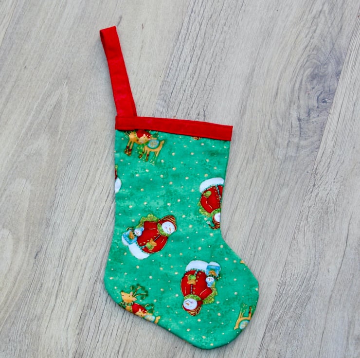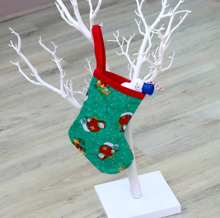 The Stocking is fully lined and made with 100% high quality cotton throughout. The outer fabric is green with a cheeky Snowmen and Reindeer pattern whilst the inner lining and hanger are a deep red.