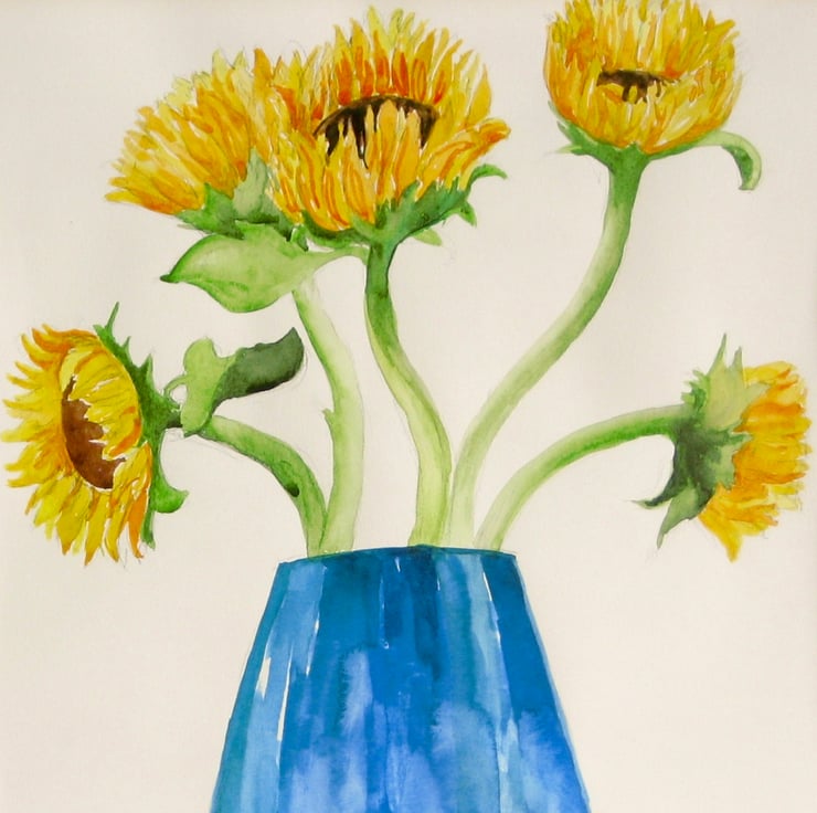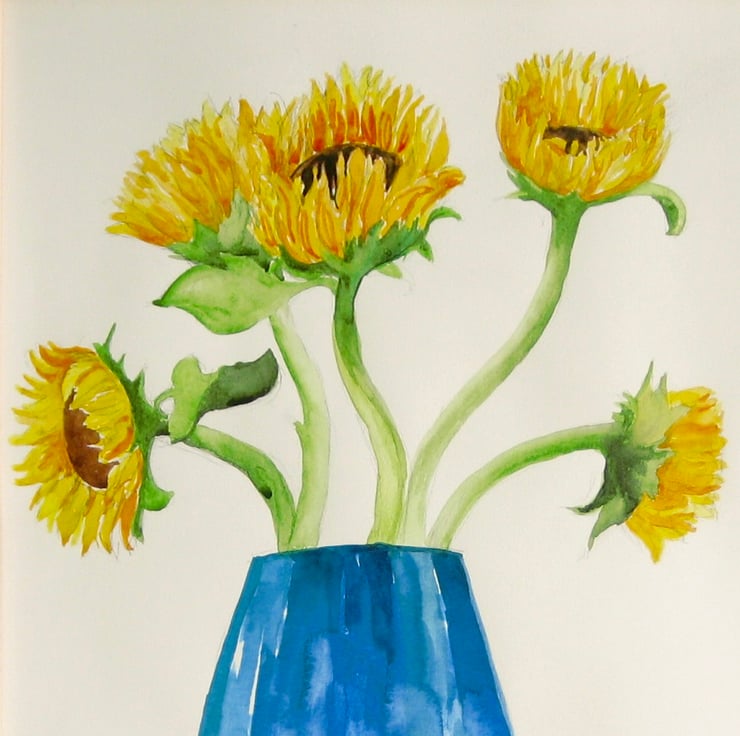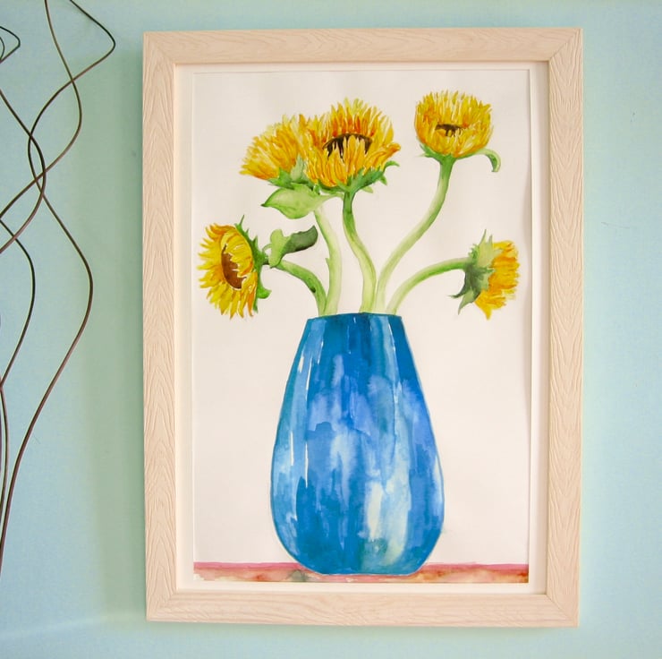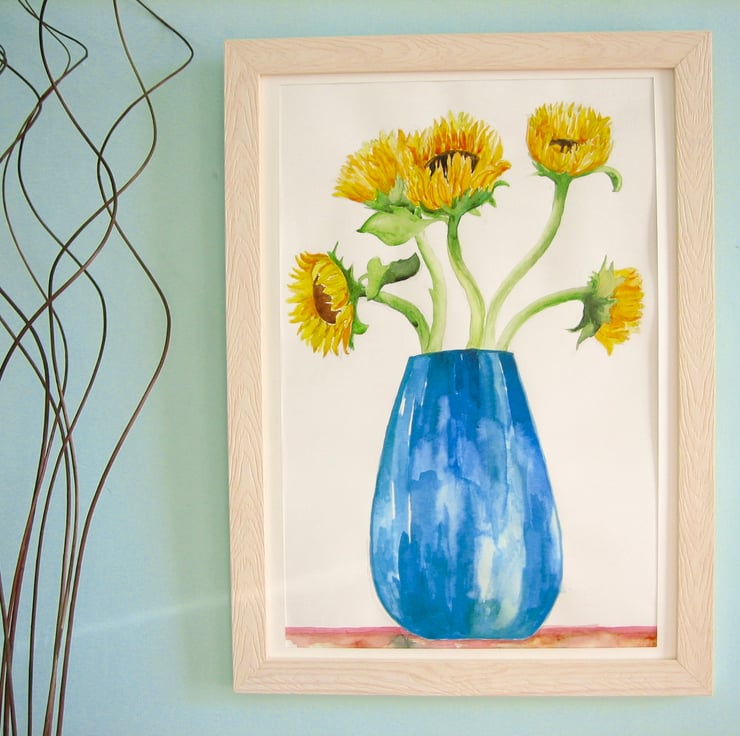 A vase of sunflowers, painted from life. I painted this vase of sunflowers on impulse, having not done any painting from life for a long time and was pleased with the result. The painting has been mounted in an A3 mount of quality paper, ready to be placed in a standard A3 frame. (The painting in the picture has been photographed without glass to avoid reflections. Any slight cockling of the paper will be flattened out with framing with glass or perspex)