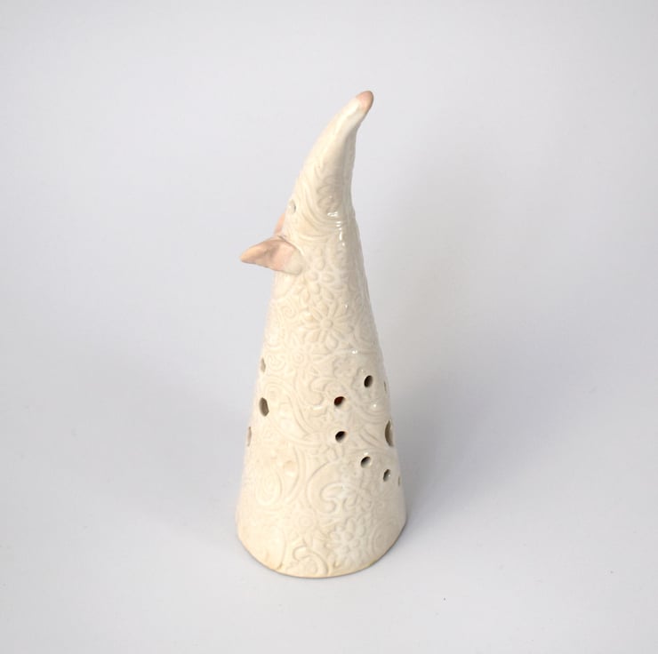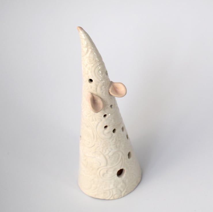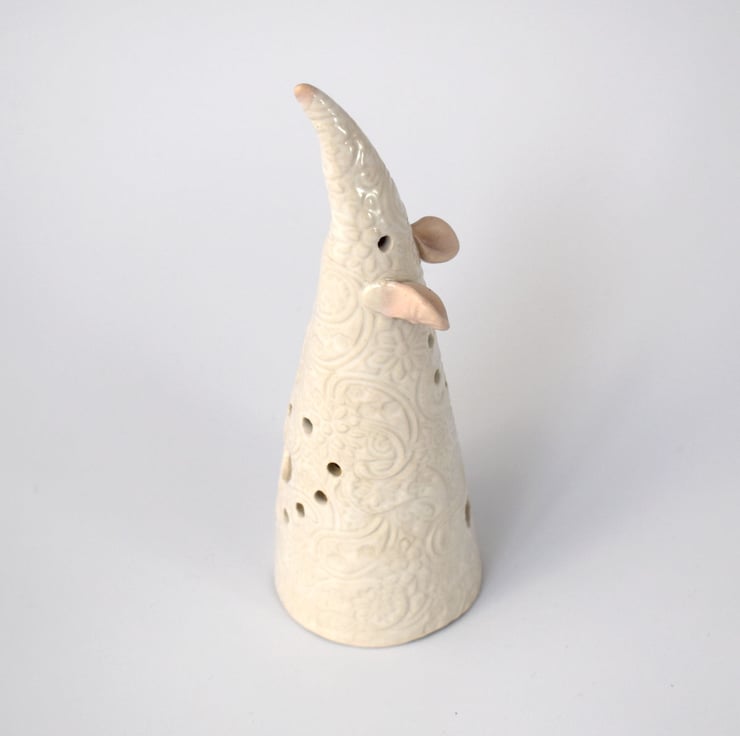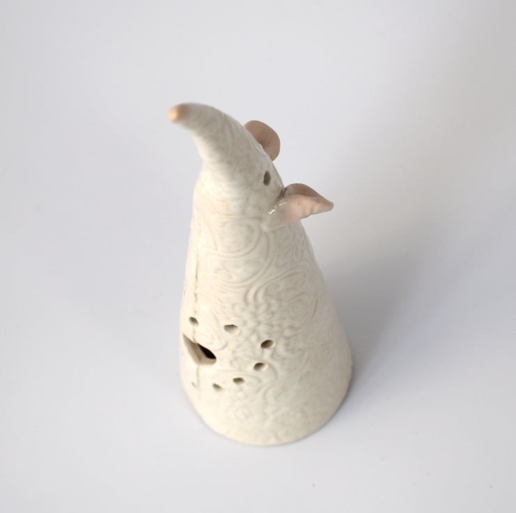 A pet rat or mouse shaped tea light cover hand built in white stoneware clay, standing approximately 16 cm tall and having a textured surface with holes to let the glow of a tealight through.