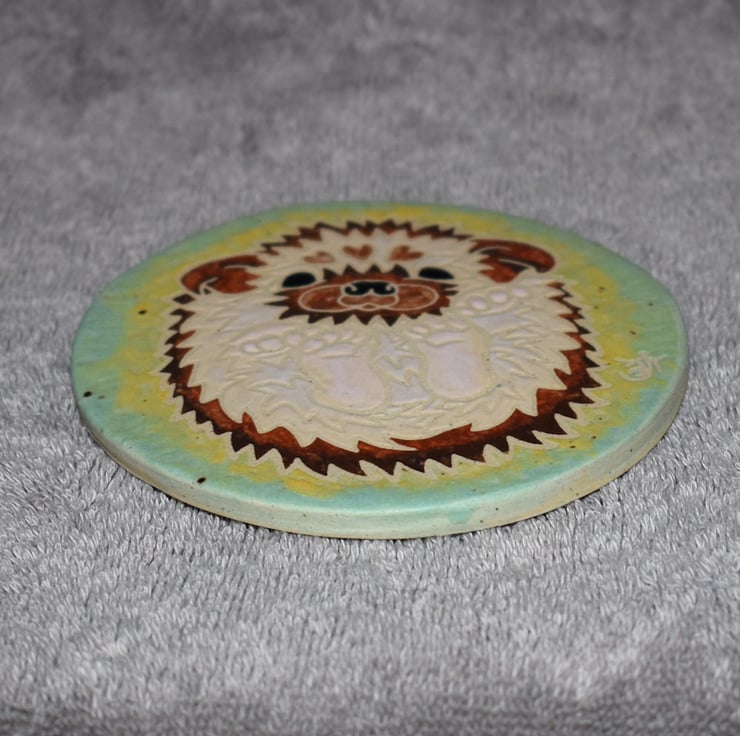 A hand thrown round plaque or coaster measuring 10.5cm diameter with a stencilled baby hedgehog design in satin matte glaze.
