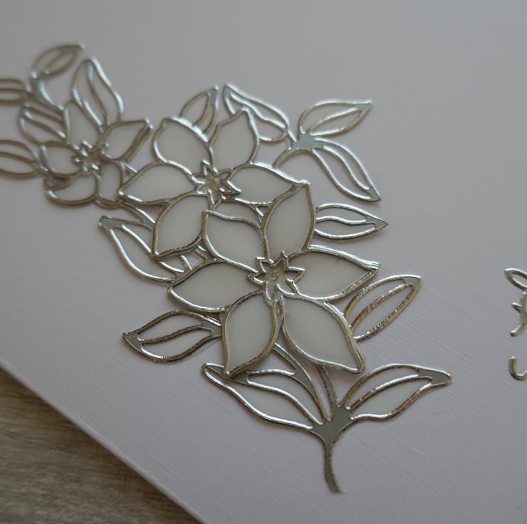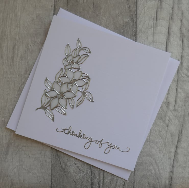 The card measures approximately 6" x 6" and is made from white linen effect card. The clematis flowers are silver peel offs that have been attached to white vellum and fussy cut. The main flower and leaves have been attached to the card and then extra vellum flowers have been decoupaged onto the card. The centre of the flowers has been coloured with a silver pen. The 'thinking of you' sentiment adds the final touch.