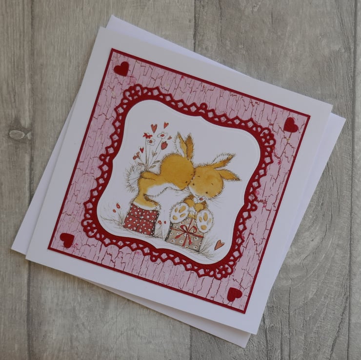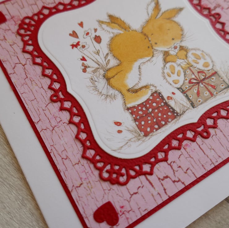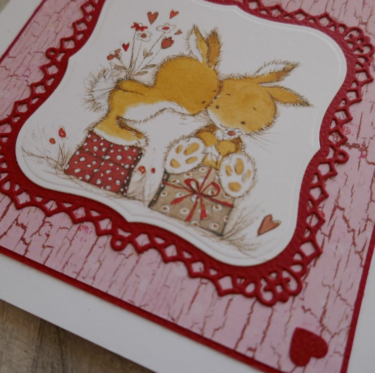 The cute Lili of the Valley precoloured image has been die cut and layered onto a dark red fancy die cut mat. This has been layered onto a pink crackle effect paper and red card. Small dark red hearts have been added to the corners of the card.