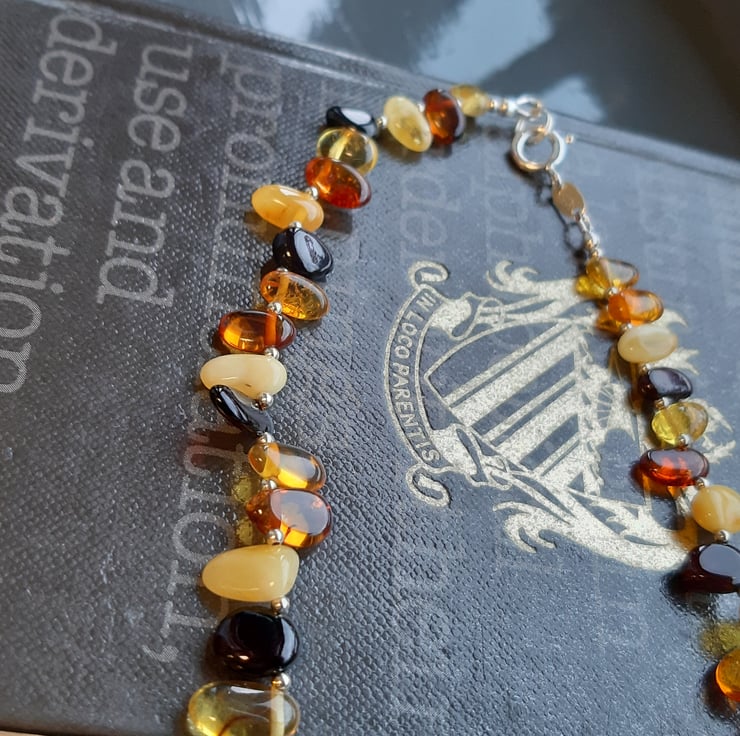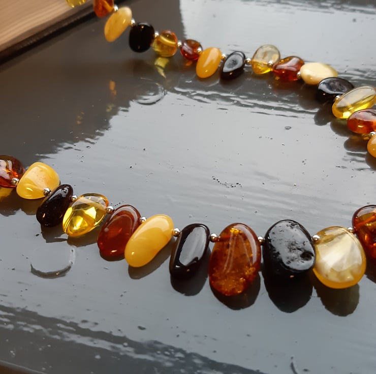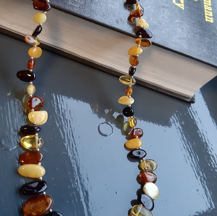 This unusual but striking necklace is made from size graduated chips of Baltic Amber. The colours include dark cherry, cognac, lemon and cloudy honey. They are separated with 2mm sterling silver beads and finished with a sterling silver bolt-ring clasp. The necklace is 21.75 inches or 55 cm in length. Being amber it is light as a feather to wear.