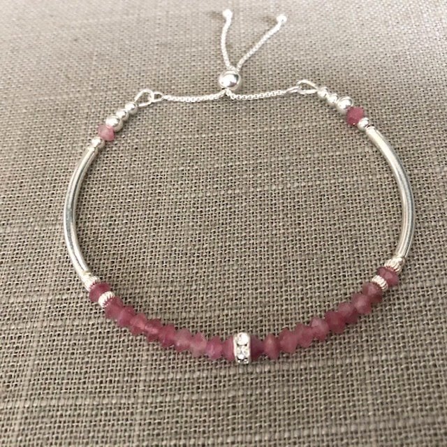 Pink Tourmaline Noodle Bracelet with CZ Stone - Handmade bracelet made with Pink Tourmaline stones, I added the Sterling Silver Rondelle bead to the centre of the bracelet, this bead has small Cubic Zirconia Stones set into it to add just a little sparkle. I finished the bracelet with a Sterling Silver slider clasp, making the bracelet fully adjustable.