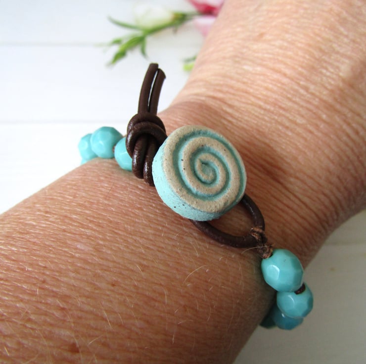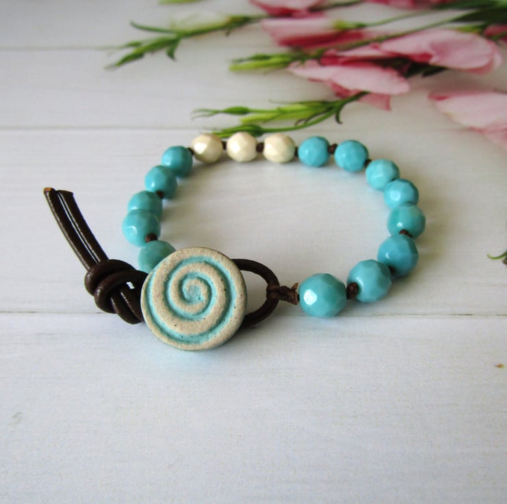 Faceted fire polished beads in opaque turquoise and cream tones have been hand knotted onto chocolate brown waxed linen cord. The bracelet is finished with a hand crafted ceramic swirl button made from stoneware clay, colour stained and left unglazed. The clasp is finished with a dark brown distressed leather knotted clasp.